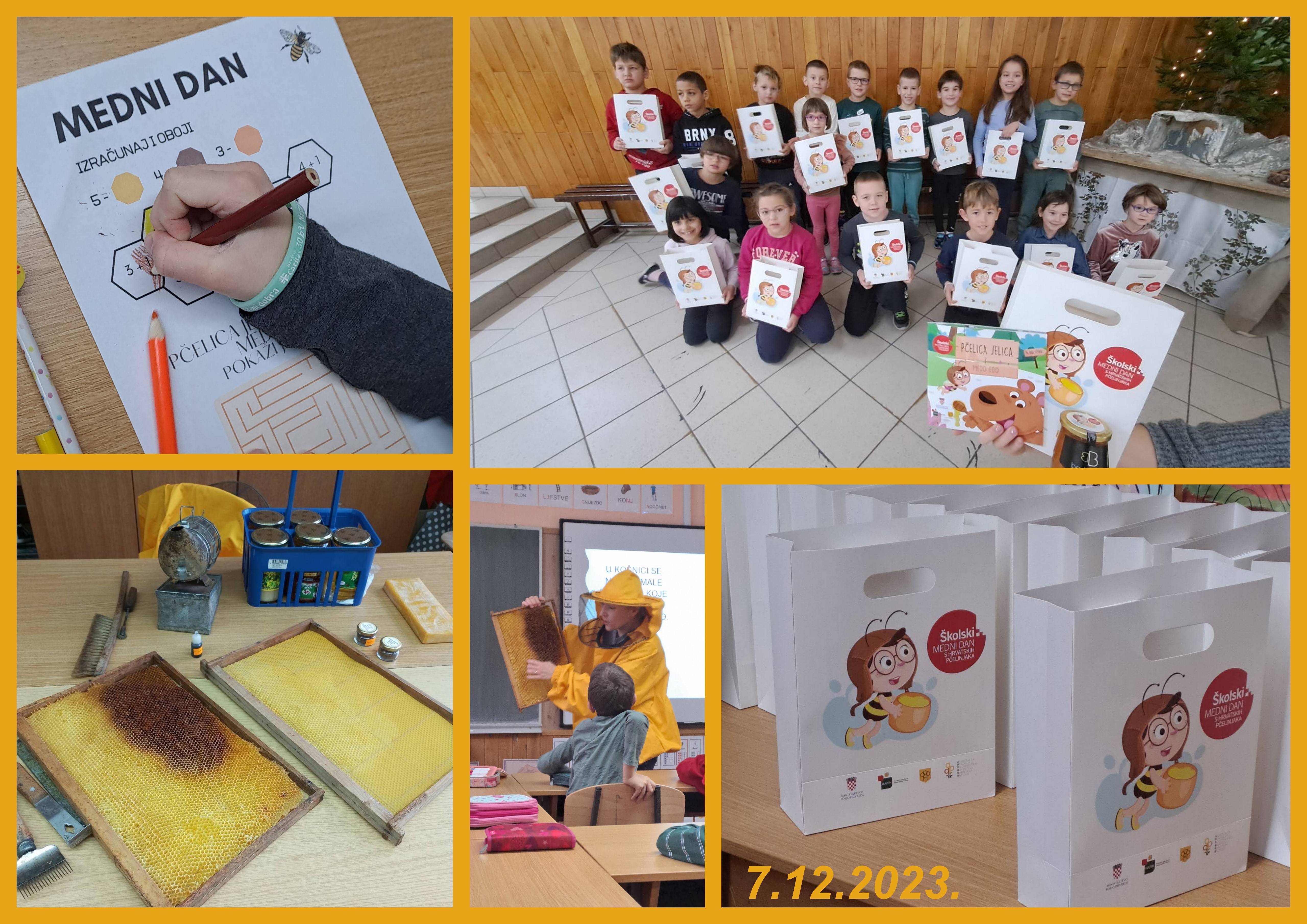 7. prosinca dan je sv. Ambrozija, zaštitinika pčelara. Svake godine na taj dan obilježavamo Školski dan meda. Učenicima 1. razreda podijeljen je promotivni paket s medom hrvatskih pčelinjaka i edukativna slikovnica Pčelica Jelica i medo Edo koju smo zajedno pročitali. Učenici 1.a i 1.b razreda zajedno su pogledali prigodnu prezentaciju, poslušali zujanje pčela, naučili neke nove pojmove kao što su matica, radilica, trut, saće, propolis i razgovarali o važnosti pčela i njihovih proizvoda. Zanimljivo je bilo pogledati različite alate koje koriste pčelari, pčelarsko odijelo, pomirisati pčelinji vosak i različite vrste meda. Na kraju su crtežom prikazali što su sve naučili te je nastao zajednički plakat u obliku saća.