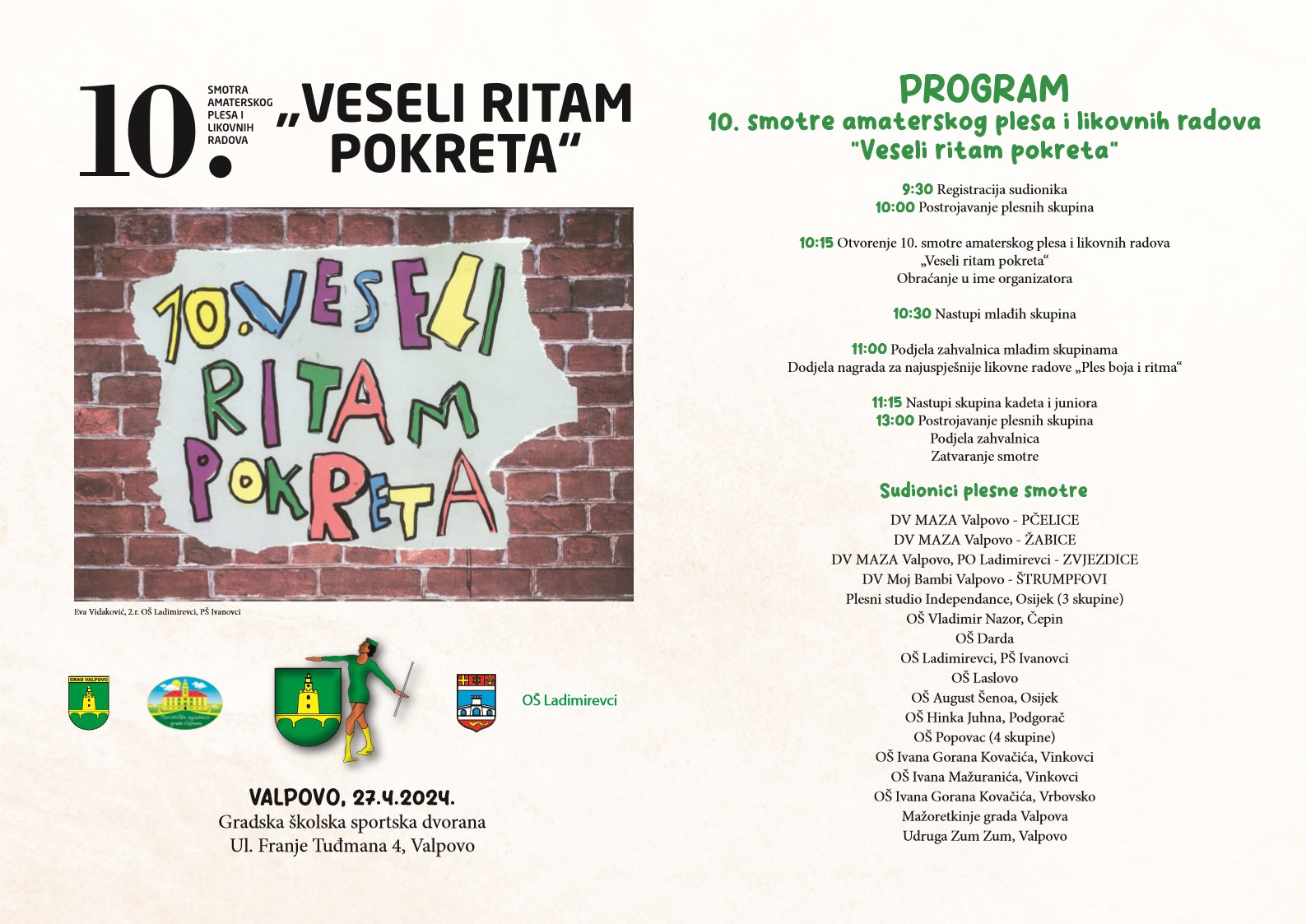 ovim putem vas pozivamo na 10. smotru amaterskog plesa i likovnih radova “Veseli ritam pokreta“ koja će se održati u subotu, 27. 4. 2024. u 9:30 sati. Smotra će se održati u Gradskoj školskoj sportskoj dvorani u Valpovu. Više informacija o programu smotre možete pronaći u priloženom plakatu.