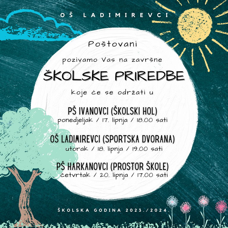 ovim vas putem pozivamo na nadolazeće školske priredbe povodom kraja školske 2023./2024. godine.