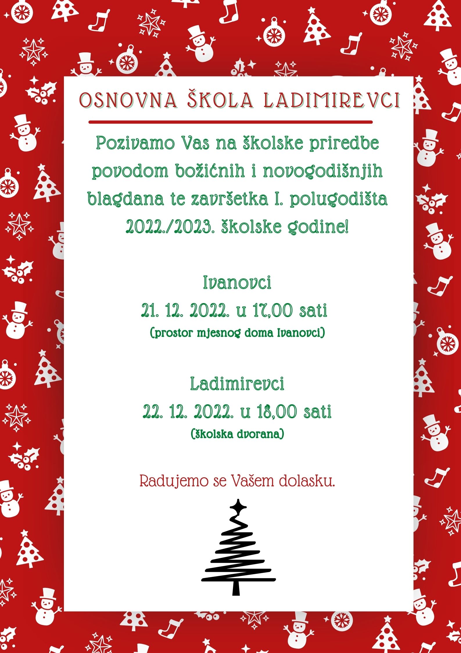 ovim putem vas pozivamo na nadolazeće školske priredbe povodom obilježavanja božićnih blagdana i kraja I. polugodišta školske 2022./2023. godine.