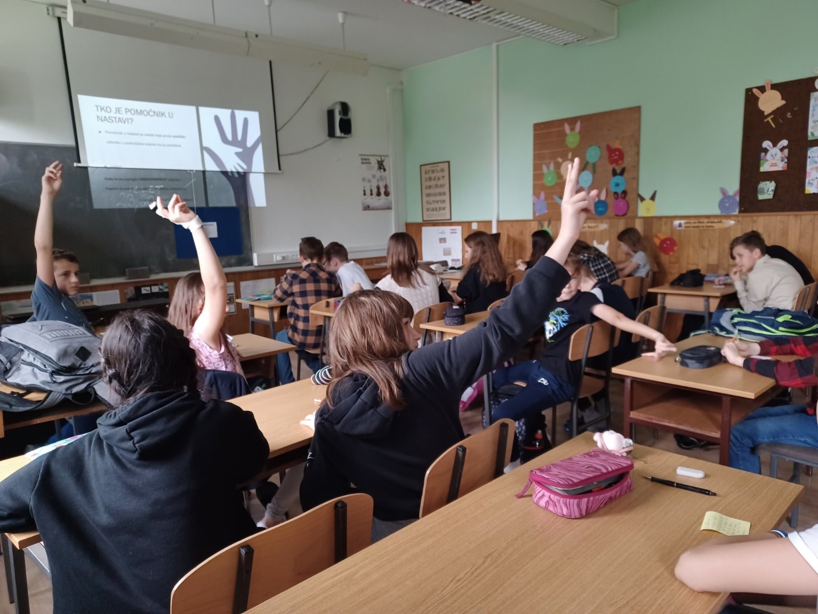 Također, u raspravi o istinama ili motivima učenici su pokazali da su uglavnom upoznati s ulogom pomoćnika u nastavi. Radionicom im je prošireno znanje, i to pomoću dijelova Pravilnika o pomoćnicima u nastavi i stručno-komunikacijskim posrednicima. Nakon što su im podijeljeni letci o projektu, učenici su još jednom ponovili što su naučili na radionici. Osim što su pokazali dobru prethodnu upoznatost s temom radionice, petaši su bili vrlo aktivni, čime su doprinijeli stvaranju interaktivne atmofere na radionici.