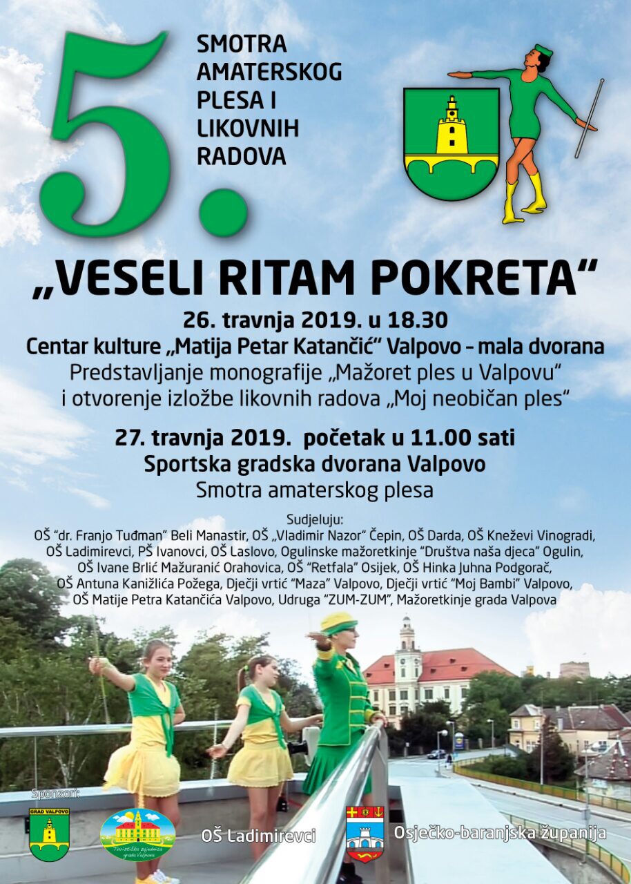 Udruga Mažoretkinja grada Valpova u suradnji s Osnovnom školom Ladimirevci organizira 5. smotru amaterskog plesa i likovnih radova „Veseli ritam pokreta“ povodom Međunarodnog dana plesa koja će se održati u Gradskoj školsko-sportskoj dvorani, Dr. Franje Tuđmana 4 u Valpovu, dana 27. travnja 2019. s početkom u 11 sati.