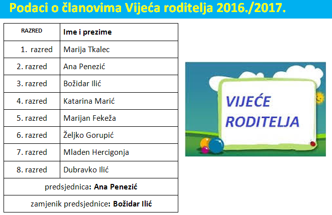 Članovi Vijeća roditelja biraju između sebe predsjednika i zamjenika predsjednika. Također, članovi Vijeća roditelja predlažu svog člana u Školski odbor.