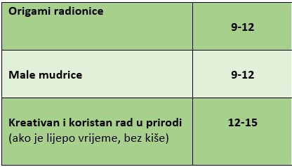 Tijekom proljetnog odmora učenika, u srijedu 20. travnja, u školi se organiziraju radionice za darovite, talentirane i motivirane učenike. Raspored radionica vidljiv je u niže prikazanoj tablici.