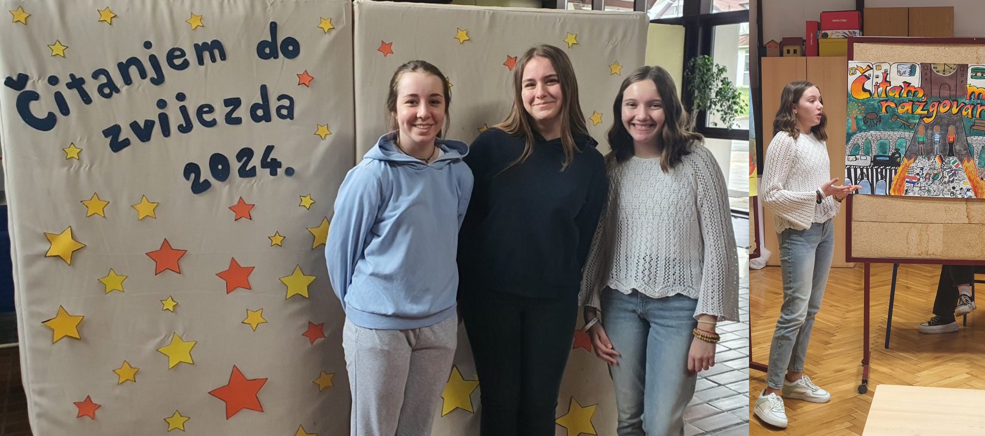 Učenice naše škole Viktorija Telišman, Marta Iveković i Sara Fekeža pod mentorstvom učiteljice Marije Dijaković sudjelovale su na županijskom natjecanju u znanju i kreativnosti "Čitanjem do zvijezda" koje se održalo u Osnovnoj školi Janka Leskovara u Pregradi. U kategoriji kviza znanja osvojile su prvo mjesto te se plasirale na državno natjecanje koje će se održati u Čakovcu tijekom svibnja. Školu je izvrsno predstavila Marta Iveković izradom i predstavljanjem plakata za koje ju je pripremala knjižničarka Valentina Mance, a koji je zauzeo peto mjesto. Čestitamo na ostvarenom rezultatu i želimo puno uspjeha u Čakovcu!