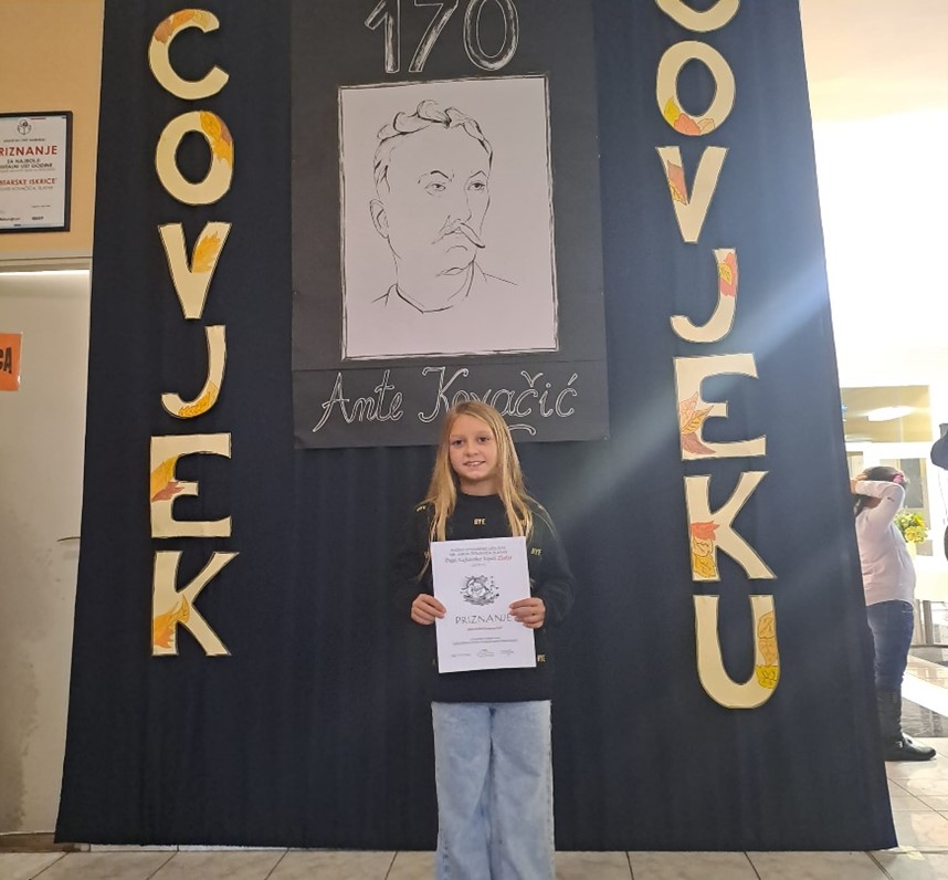 U subotu, 28. rujna 2024.g., u OŠ Ante Kovačića u Zlataru svečano je otvorena dječja likovna izložba „Čovjek čovjeku“ u sklopu manifestacije „Dani kajkavske riječi“. Na otvorenju likovne izložbe bila je i učenica naše škole, Aleksandra Kramarić, učenica 3. razreda, čiji je likovni rad odabran za izložbu. Čestitke Aleksandri na uloženom trudu i postignuću, kao i mentorici Silviji Ilić!