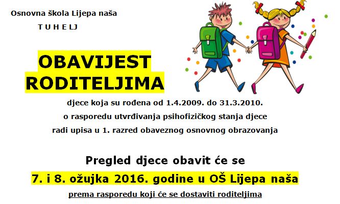 Obavještavamo Vas da ste do pregleda dužni s djetetom obaviti: