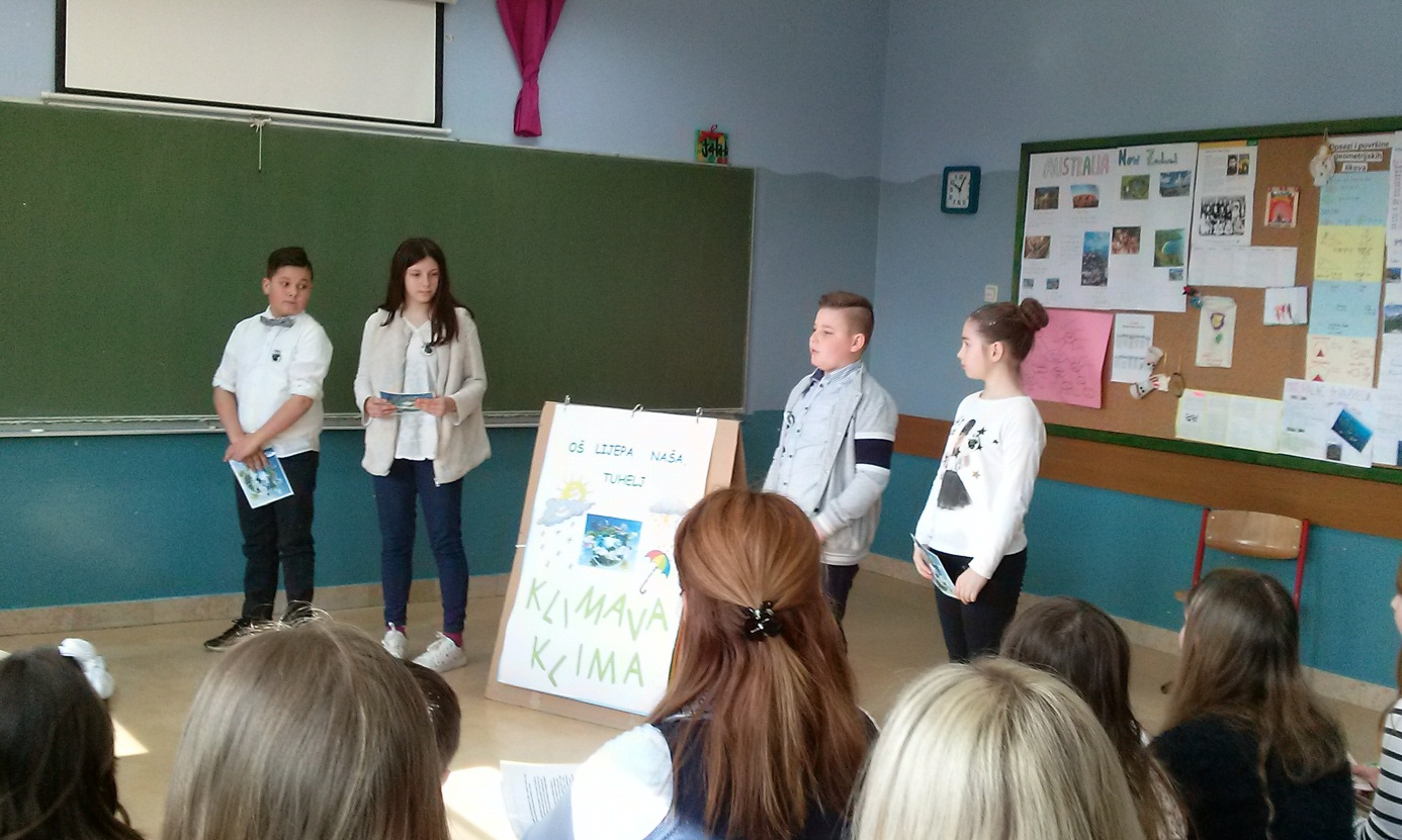 Članovi DTM grupe, koju čine učenici od 3. do 5. razreda na ovogodišnjoj smotri projekata Građanskog odgoja i obrazovanja predstavili su projekt naše Škole“ Klimava klima“. Povod za istraživanje i izradu projekta bile su česte i nagle vremenske promjene kojima smo svakodnevni svjedoci. Projekt se javio kao posljedica učeničkih propitkivanja zašto vrlo rijetko pada snijeg u vrijeme zimskih praznika? U sklopu izrade projekta posjetili smo Automatsku meteorološku stanicu u Tuhlju te istraživali vremenske prilike. Zaključak učenika bio je da je uzrok klimatskim promjenama u zagađenju okoliša. S tim ciljem bit će organizirane edukativne radionice te, iako u školi postoji svijest o važnosti očuvanja okoliša, još ćemo se malo više angažirati na razvrstavanju otpada i akcijama vanjskog uređenja okoliša. Na županijskoj smotri u Stubičkim Toplicama projekt su predstavili učenici 5. razreda Sandra Bednjanec i Petar Marić i 3. razreda Vito Žlender i Mihaela Medvedec. Stručno Povjerenstvo nakon prezentacije projekta pohvalilo je ideje i nastojanja učenika te projekt predložilo za državnu smotru Građanskog odgoja i obrazovanja koja će biti krajem svibnja u Zagrebu.