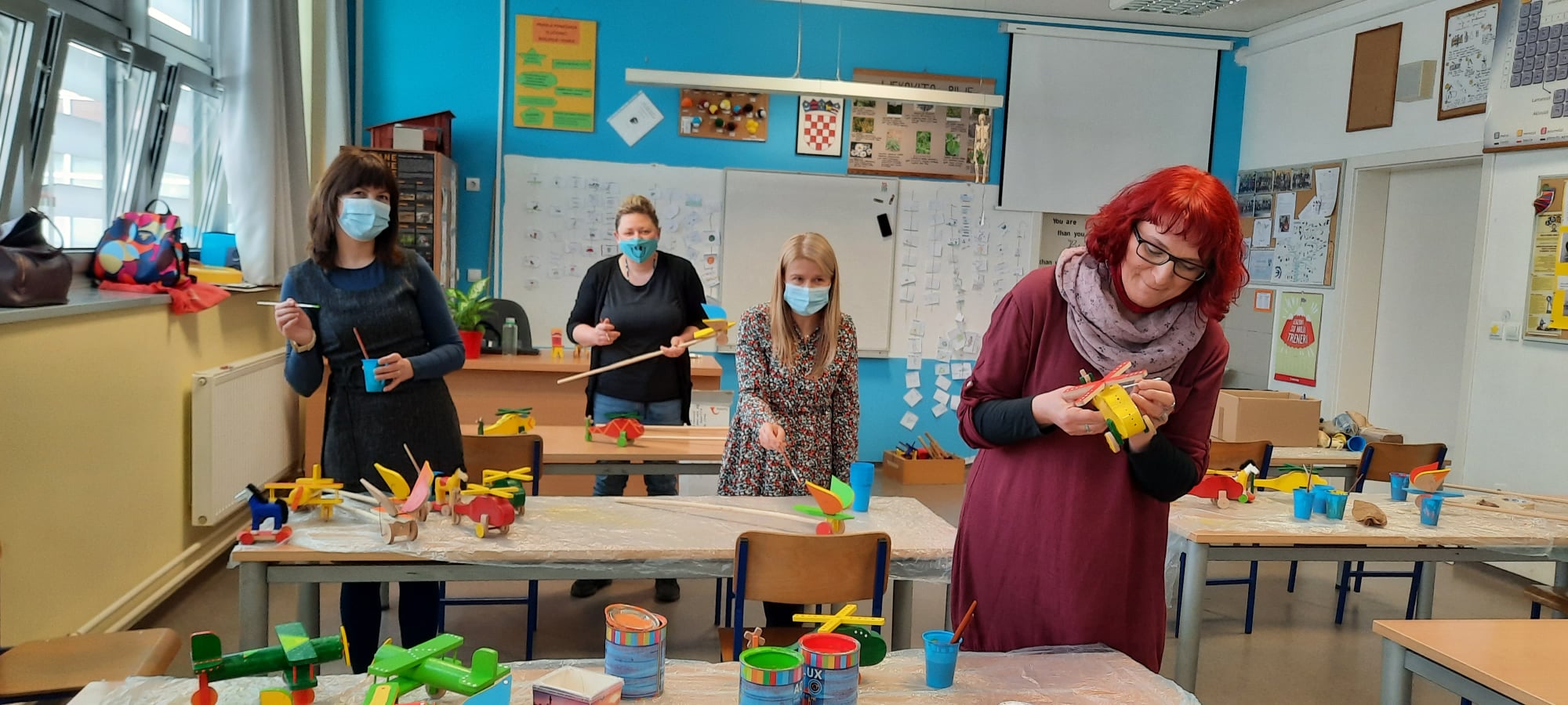 Tijekom travnja i svibnja završene su aktivnosti u okviru projekta Izrada eko etno igračaka (o čijoj je provedbi već prethodno izvještavano), a koji se provodio u matičnoj i područnoj školi. U srijedu 28. travnja 2021. održana je tematska radionica Tradicijski način bojanja igračaka za učitelje, voditeljica je bila učiteljica tehničke kulture Ivana Kapetanović, a sudionice učiteljica informatike Mirjana Mikec, učiteljica hrvatskog jezika Zvjezdana Sikra-Golemac, učiteljica biologije Emanuela Živković i vjeroučiteljica Danijela Popadić. Saznale su da su drvene igračke Hrvatskog zagorja tradicijski hrvatski proizvod nastao u 19. stoljeću, da su ih ručno izrađivali muškarci, a žene su ih bojale. Posebne boje za igračke bile su žuta, zelena, crvena i plava, a ocrtavale su ih motivima iz prirode. Njihovo je važno obilježje i jedan neprekinuti niz bijele boje koji označava čuvanje tradicijskog načina izrade. Učiteljice su bile vrlo vrijedne i koncentrirane pa su veselim bojama obojile helikoptere, zrakoplove, leptire i konjiće na kotačićima.