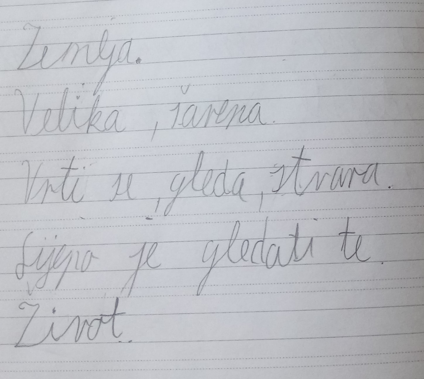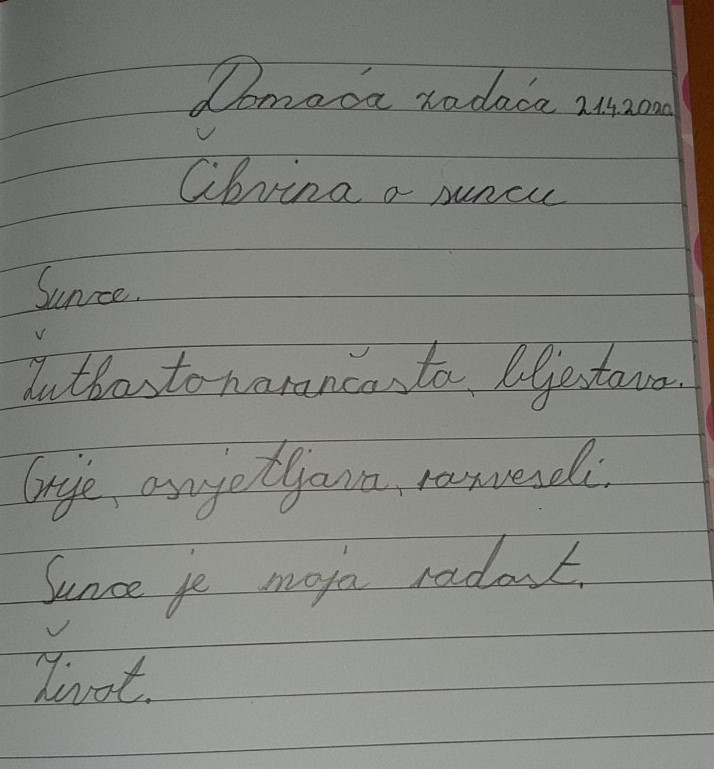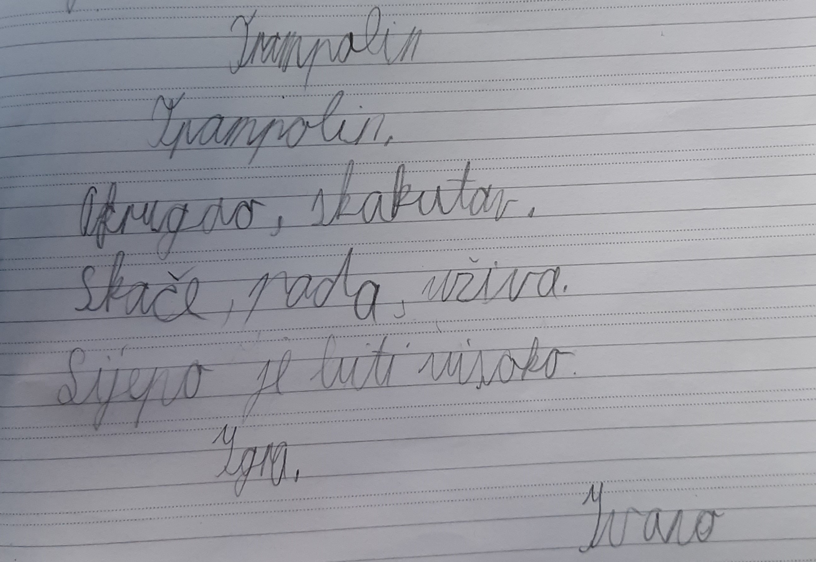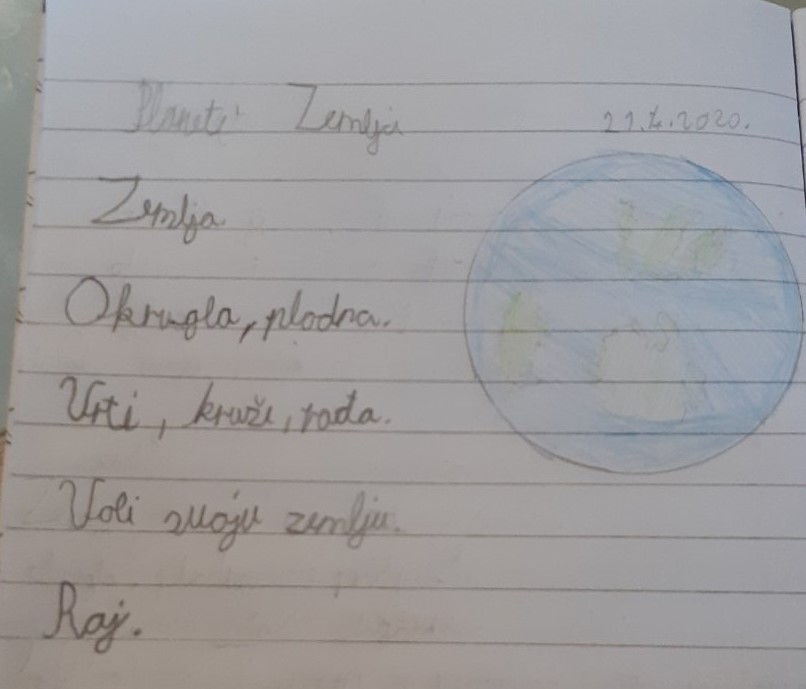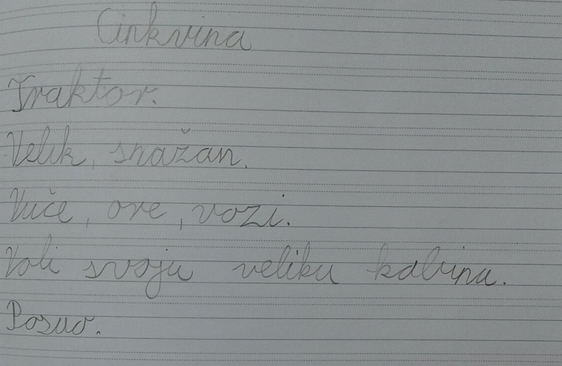 Dječak se zove Pero. Srednjeg je rasta, snažan i vitak. Ima raščupanu crnu kosu koja mu pada preko očiju. Oči su mu velike i plave, ali često su skrivene iza naočala. Nos mu je malen, usne takne i bijeli zubi. Uvijek je nasmijan i veseo. On je vrijedan, hrabar i domišljat. Voli pomagati ljudima i družiti se s prijateljima. Voli sport i tako se oblači. Kod njega najviše volim osmijeh i njegovu dobrotu.