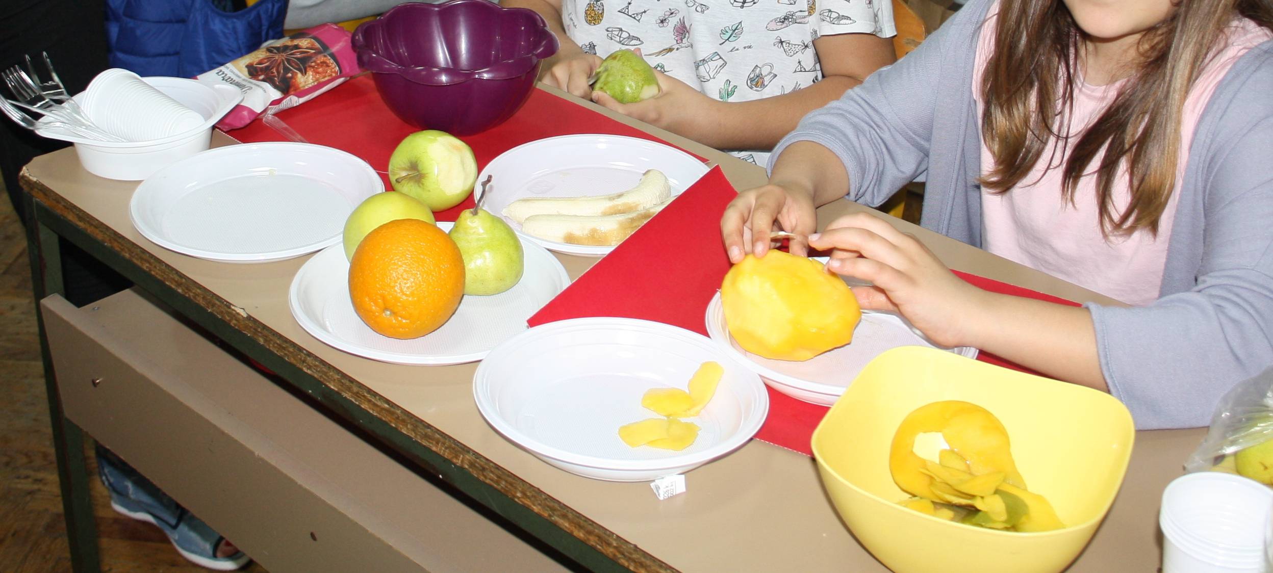 Učenici su oprali sezonsko voće koje su donijeli od kuće- jabuke, kruške, grožđe, jagode, trešnje... Narezali su voće na kockice i zasladili ga smeđim šećerom.