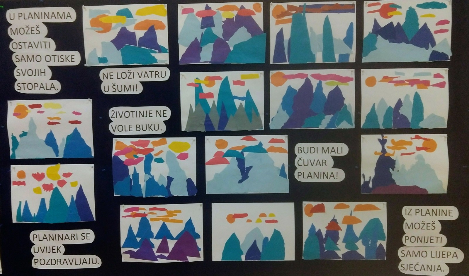 Razgovarali su o pravilima ponašanja u planinama i očuvanju prirodnih ljepota. Kao podsjetnik na važnost pravilnog odnosa prema prirodi pano su ukrasili svojim likovnim radovima i eko porukama. Posebno im se svidjela društvena igra koju je za njih izradila učiteljica jer su kroz igru mogli pokazati sve što su saznali o planinama, planinarenju i općenito o pravilnom odnosu prema prirodi.