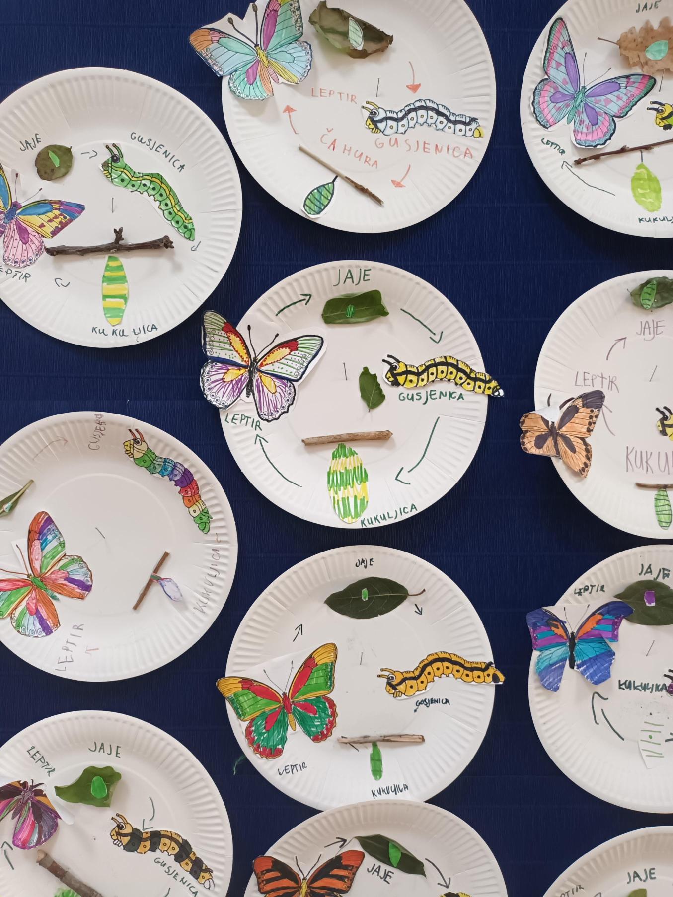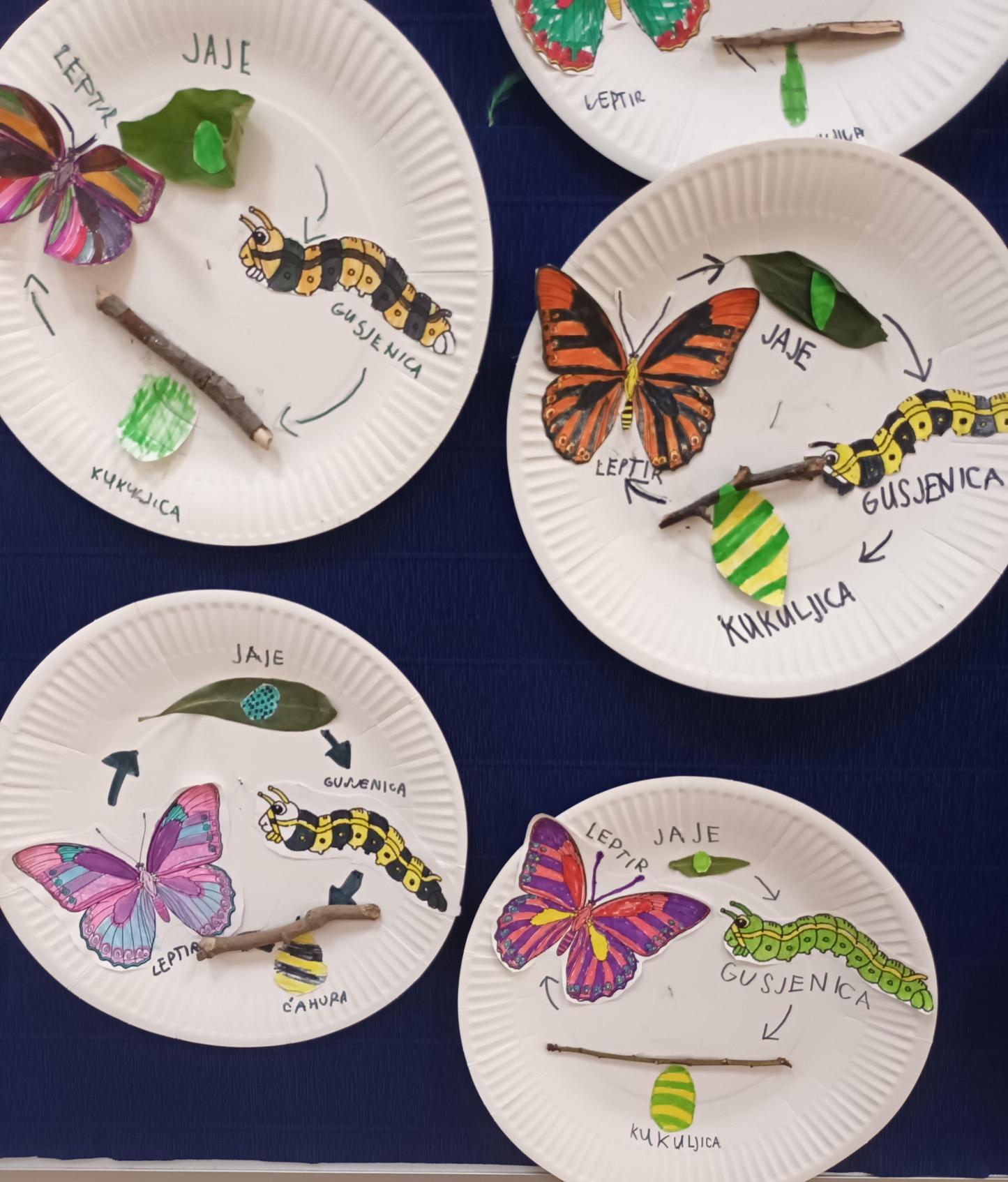 Učenici 2.c razreda, u sklopu Eko grupe, obilježili su dolazak proljeća izradom eko vjenčića i prikazom ciklusa života leptira. Eko vjenčiće izradili su od kutija za jaja u kombinaciji sa slikarskom tehnikom tempera. Životni ciklus leptira učenici su prikazali na papirnatim tanjurićima, a pri tom su se koristili prirodnim materijalima koje su pronašli u školskom vrtu.