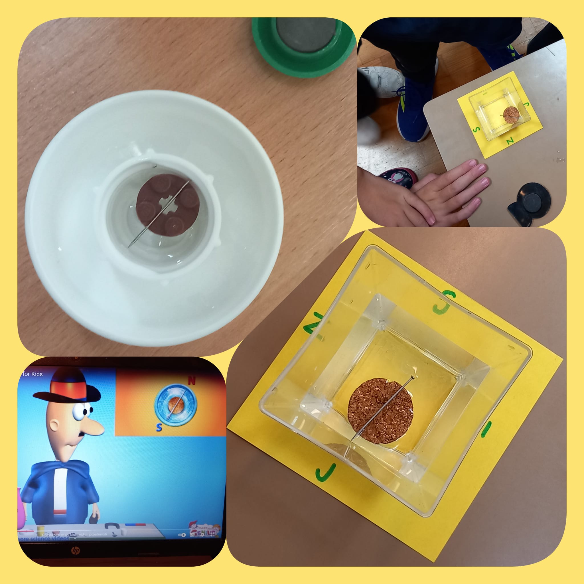 Učenici 3. b razreda gledali su kratki video o nastanku koompasa te su izrađivali kompas od otpadnih materijala (pluteni čepovi, igla, plastične časice od kolača, ostaci kolaž papira). Uz pomoć učiteljice magnetizirali su iglu, časicu napunili vodom te stavili magnetiziranu iglu na pluteni čep. Na kolaž papiru su označili strane svijeta. Učenici su okretali časicu i na kraju zaključili kako se zadebljani vrh igle uvijek okreće prema sjeveru. Na taj su način ponovili znanje o snalaženju u prostoru. Kasnije su se pojedini učenici dosjetili još jednog načina izrade kompasa. Za svoj su kompas iskoristili plastični zatvarač boce te plutajuću LEGO kockicu.