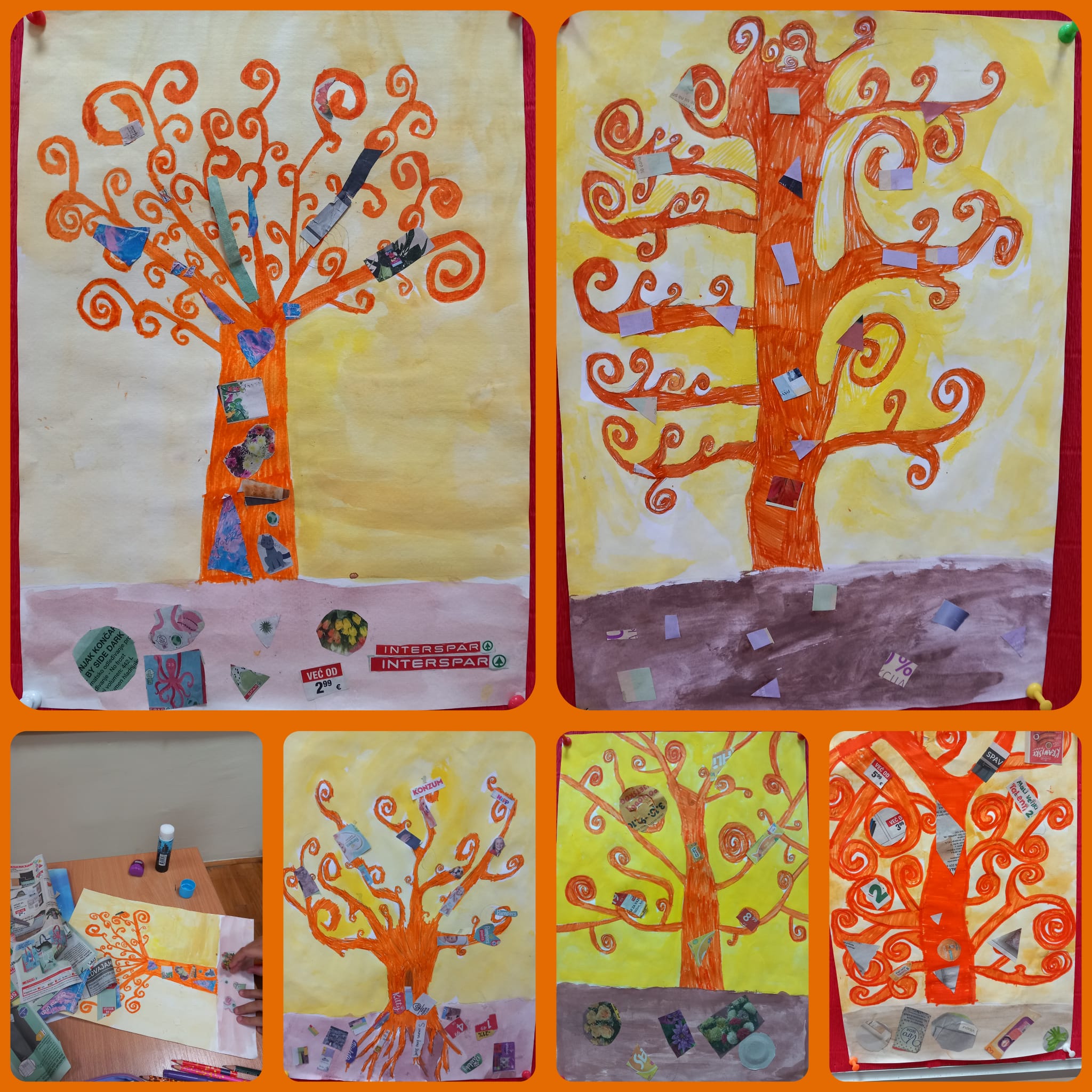 Učenici su crtali Drvo života po uzoru na umjetnika Gustava Klimta. Geometrijske i slobodne oblike rezali su od novinskog papira i lijepili na svoje drvo.