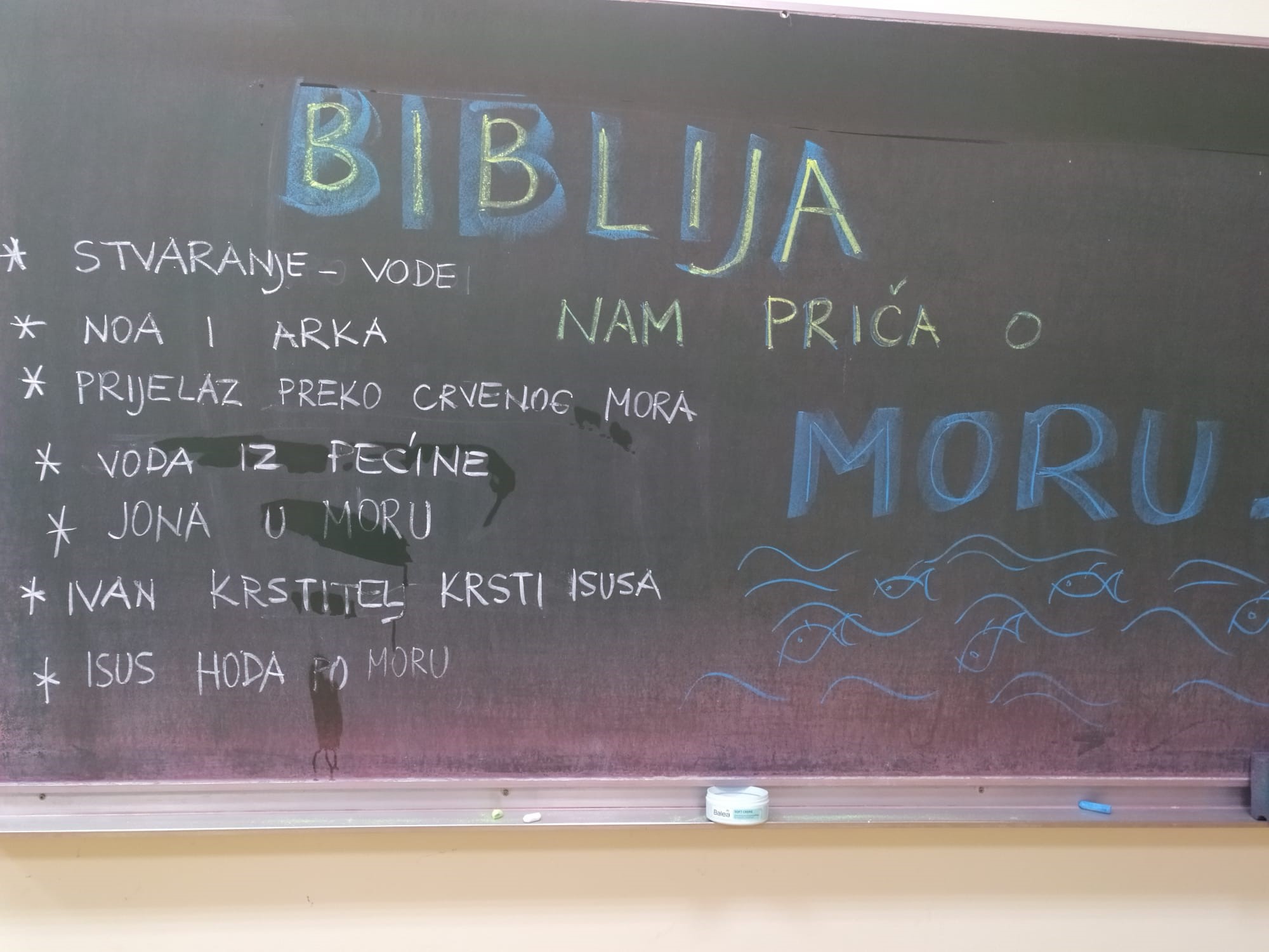 Na početku radionice djecu sam upoznala sa biblijskim tekstovima iz Starog i Novog zavjeta o moru. Kroz prezentacije i razgovor upoznali smo značaj mora u Svetom pismu i posvijestili smo važnost očuvanja mora.