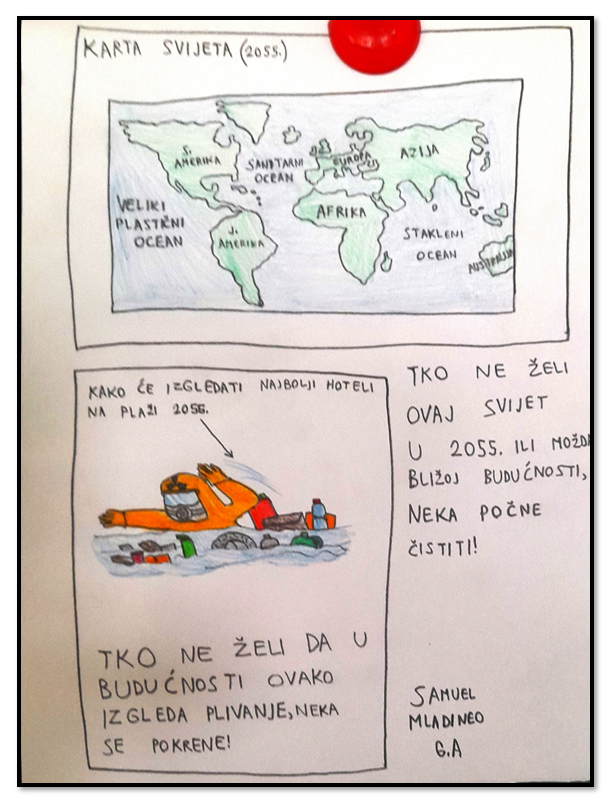 Doznali su kako se kreću morske struje u svjetskim oceanima i Jadranskom moru, kako one djeluju na nastanak oceanskih „vrtloga otpada“, koje vrste otpada i u kojim postocima (iz grafikona) se nalaze u svjetskim morima i Jadranskom moru i koji su najvažniji uzroci gomilanja plastičnog otpada. Nučili su i značenje pojmova: mikroplastika, mezzoplastika i makroplastika i kakav poguban utjecaj plastika ima na živi svijet u moru, ali i na čovjeka. Razgovarali smo i o idejama za rješavanje problema koje smo pronašli na internetu i o onima koje učenici imaju.