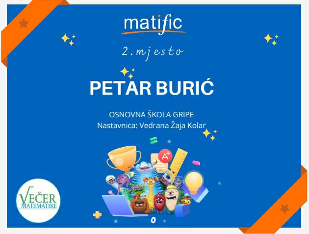 Učenici od 1.- 6. razreda imali su priliku sudjelovati u zanimljivom natjecanju održanom 3.12. 2020. i rješavati zadatke u Matificu, digitalnom programu za učenje i podučavanje matematike u kojem je naš učenik Petar Burić, 4.b osvojio drugo mjesto. Čestitamo!