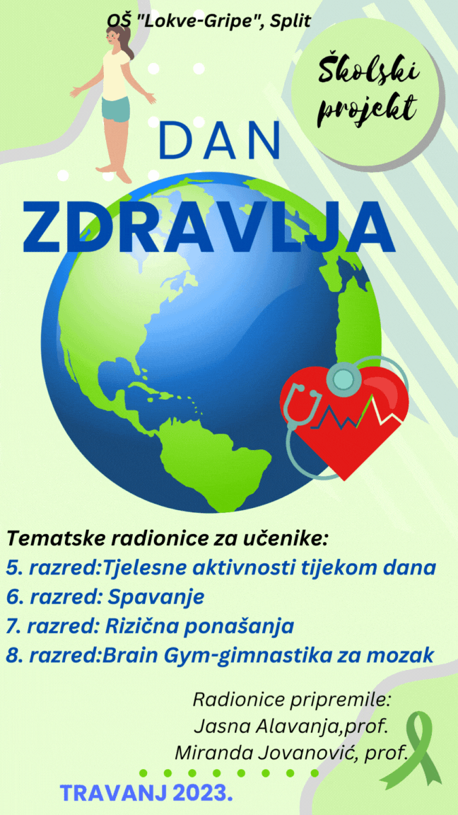 Potaknuti tim, tijekom travnja u našoj školi provest ćemo školski projekt „Dan zdravlja“ kako bismo s djecom, a ona sa svojim obiteljima osvijestili važnost brige o zdravlju. Cilj projekta je promovirati zdrav način života kroz tjelesno, emocionalno, mentalno i socijalno zdravlje.
