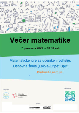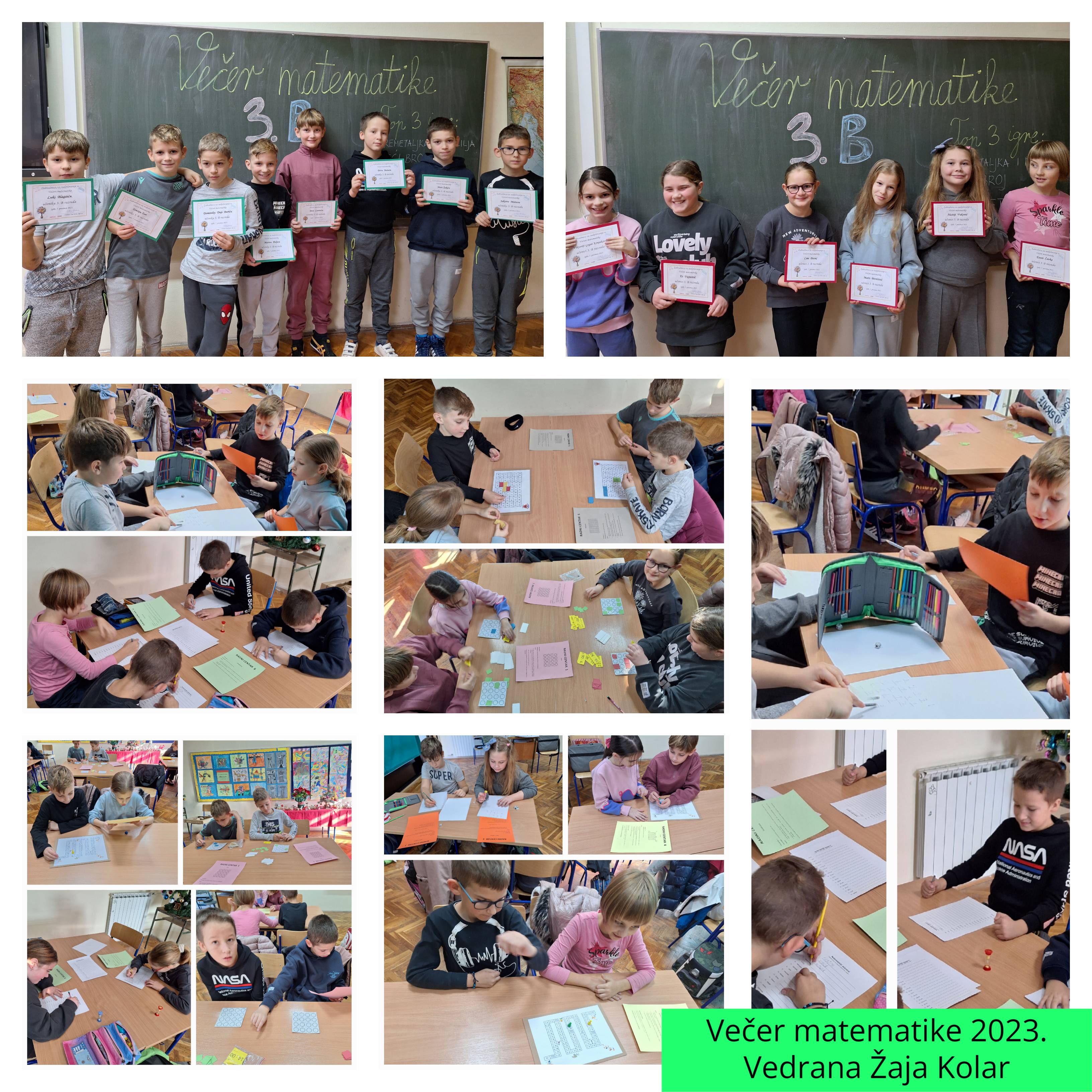 Projekt Večer matematike 2023. u organizaciji Hrvatskog matematičkog društva, uz potporu Ministarstva znanosti i obrazovanja Republike Hrvatske realiziran je u našoj školi u četvrtak, 7. prosinca 2023. s početkom u 18 sati. Za učenike viših razreda projekt su realizirale učiteljice matematike Jelena Udovičić (6.b, 6.c,7.b) i Miranda Jovanović (5.a, 6.a,7.a). Učiteljice razredne nastave Marija Zelić (1.b), Marina Đapić i Antea Teskera (1.c), Petra Roić (2.b), Vedrana Žaja Kolar (3.b) i Ana Ostojić (3.c) realizirale su ovaj projekt u nižim razredima te su izabrale vlastiti termin, vrijeme i način realizacije.
