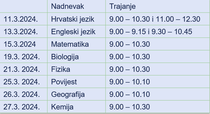 Raspored nastavnih sati za dane u kojima pišu nacionalne ispite, učenici su dobili od svojih razrednika. Na dan pisanja ispita iz Hrvatskoga jezika, učenici nemaju dodatnih nastavnih sati.