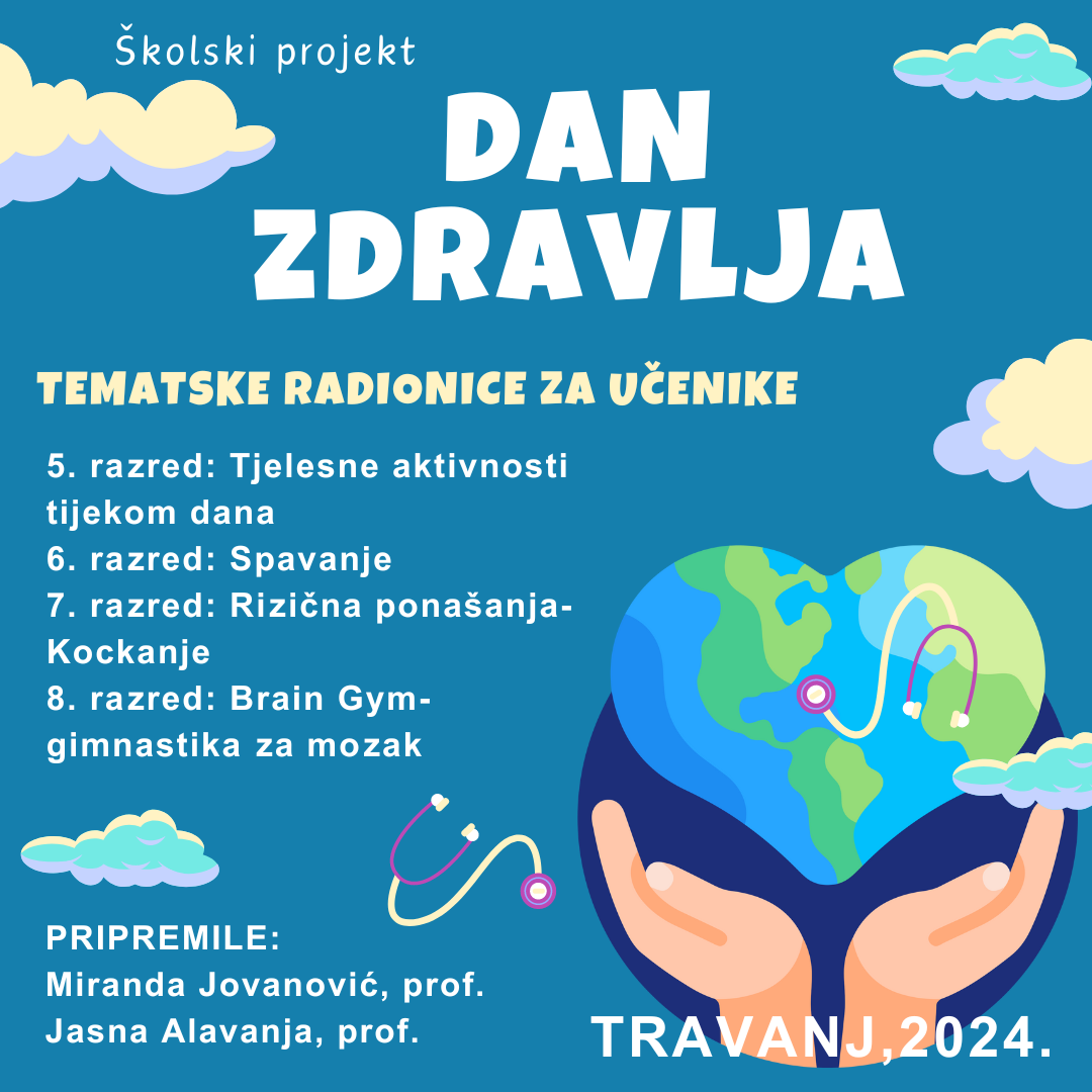 Potaknuti tim, tijekom travnja u našoj školi provest ćemo školski projekt „Dan zdravlja“ kako bismo s djecom, a ona sa svojim obiteljima osvijestili važnost brige o zdravlju. Cilj projekta je promovirati zdrav način života kroz tjelesno, emocionalno, mentalno i socijalno zdravlje.