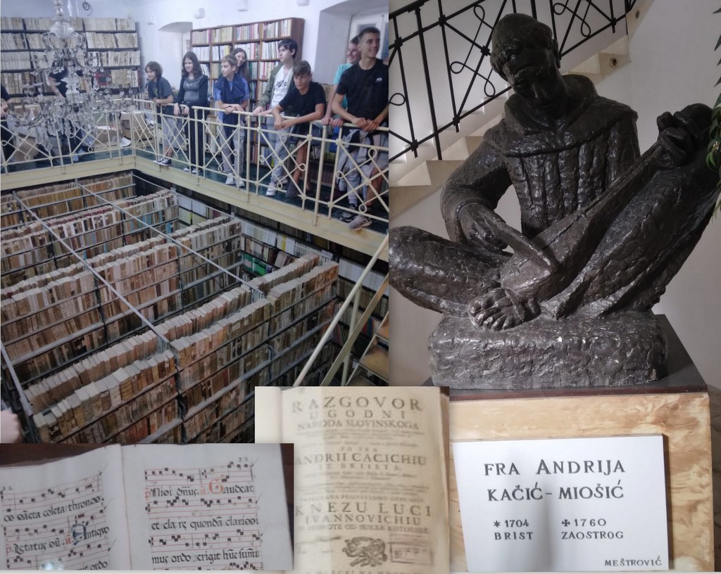 Tu su učenici, uz stručno vodstvo, razgledali muzej, knjižnicu koja broji 25 000 knjiga, a u kojoj se inače čuvaju 24 inkunabule, ali su trenutno na reparaciji u Splitu, botanički vrt i memorijalnu galeriju Mladena Veže. Na samom ulazu u crkvu pokopan je veliki hrvatski pjesnik fra Andrija Kačić Miošić koji je životom bio vezan za samostan, a čija je knjiga Razgovor ugodni naroda slovinskoga iz 1756. godine, jedno od najvrjednijih djela hrvatske književnosti 18. stoljeća. Učenici su u muzeju vidjeli i reljef "Rane sv. Frane"; velikog hrvatskog kipara Ivana Meštovića.