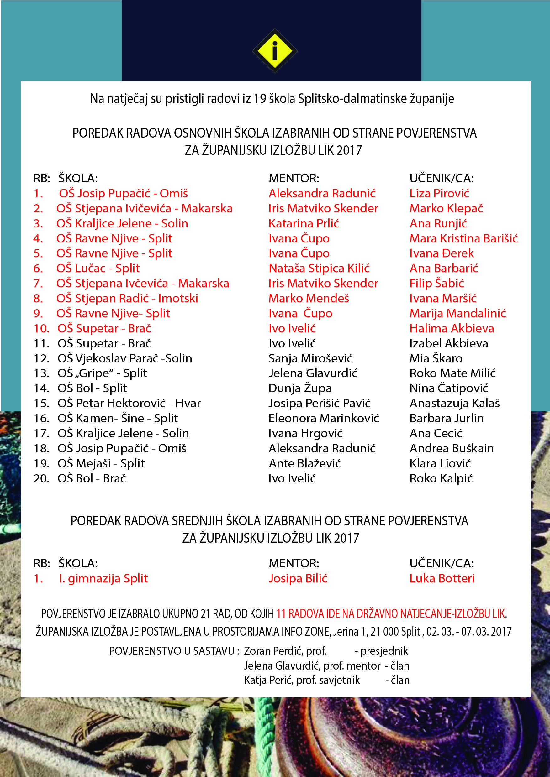 Radovi su odabrani na natječaju iz područja vizualnih umjetnosti i dizajna – LIK 2017. u organizaciji Ministarstva znanosti i obrazovanja te Agencije za odgoj i obrazovanje.