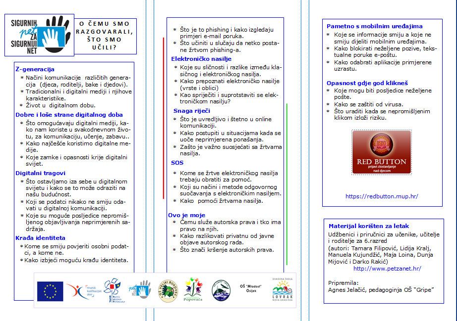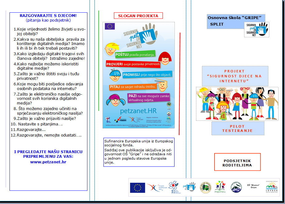 Osnovna škola „Gripe“ ulazi u Europsku uniju s 2,5 milijuna kuna namijenjenih izradi školskog kurikuluma o sigurnosti djece na internetu. Zajedno s partnerskim školama OŠ „Veliki Bukovec“ iz Velikog Bukovca, OŠ Mate Lovraka iz Nove Gradiške, OŠ „Popovača“ iz Popovače, i OŠ „Mladost“ iz Osijeka dobili smo za projekt „Sigurnost djece na internetu“ financiranje iz IPA programa Razvoj ljudskih potencijala na natječaju „Daljnji razvoj i primjena Hrvatskog kvalifikacijskog okvira“. Podršku pri realizaciji projekta pružat će Hrvatska akademska mreža CARNet, Agencija za odgoj i obrazovanje, Agencija za zaštitu osobnih podataka te niz lokalnih institucija i organizacija.