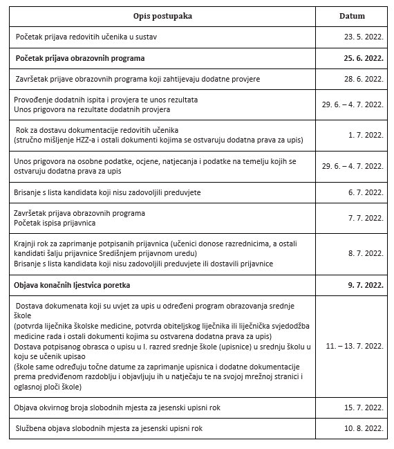 Iz Odluke izdvajamo tijek postupka u ljetnom upisnom roku po nadnevcima.