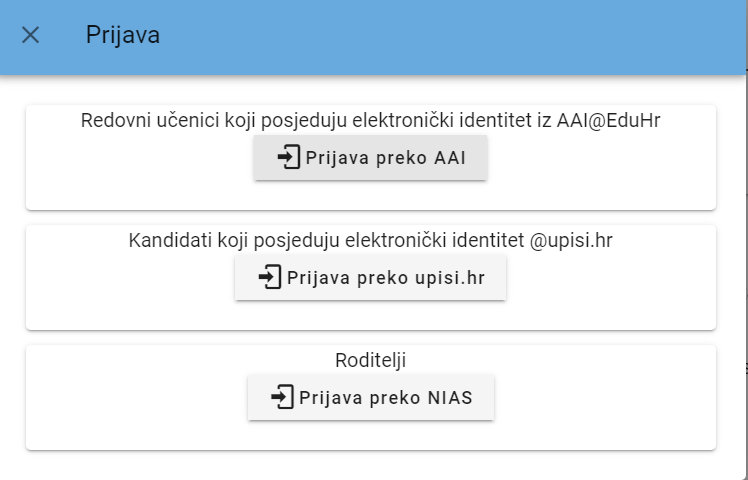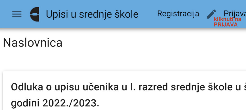 Prva radnja koju je potrebno napraviti je prijava u sustav. Prijave započinju 23. svibnja 2022. Za prijavu je potrebno kliknuti na Prijava u desnom gornjem kutu, a zatim se prijaviti elektroničkim identiteom iz AAI@EduHr