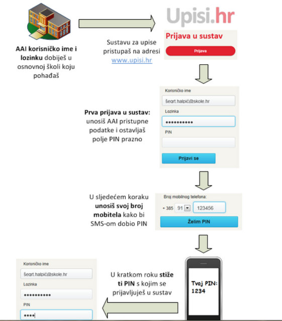 Pri prvoj prijavi unosi se korisničko ime i lozinka (AAI korisničko ime i lozinku), a polje s PIN-om se ostavlja prazno.Nakon toga unosiš broj mobitela na kojega želiš da ti bude dostavljen SMS s PIN-om. Nakon što zaprimiš PIN, pri svakoj sljedećoj prijavi u sustav unosiš korisničko ime, lozinku i PIN. Ukoliko PIN nije stigao SMS-om potrebno je ponovno pokušati unijeti broj mobitela. Po uspješnoj prijavi u sustav moguće je pregledati osobne podatke i ocjene a nakon što se iz e-Matice prenesu i rezultati natjecanja, bit će moguće pregledati i te podatke. U slučaju nepravilnosti u podacima potrebno se javiti svom razredniku.