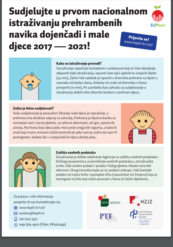 pozivamo Vas da budete dio prvog Nacionalnog istraživanja prehrambenih navika dojenčadi i male djece, koje se provodi na reprezentativnom uzorku djece od 3 mjeseca do 9 godina, na području cijele Republike Hrvatske. Vaše sudjelovanje ključan je čimbenik uspješnog provođenja ovog istraživanja