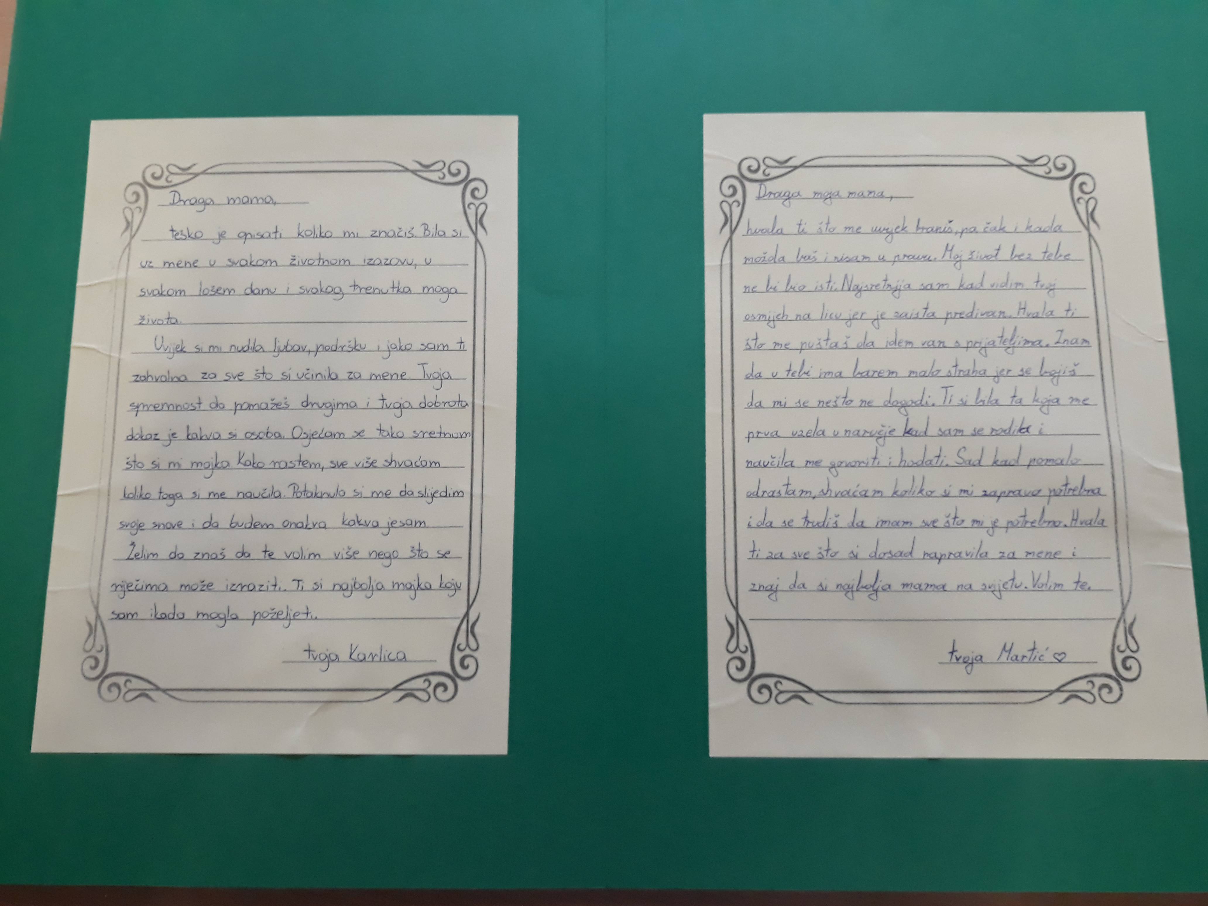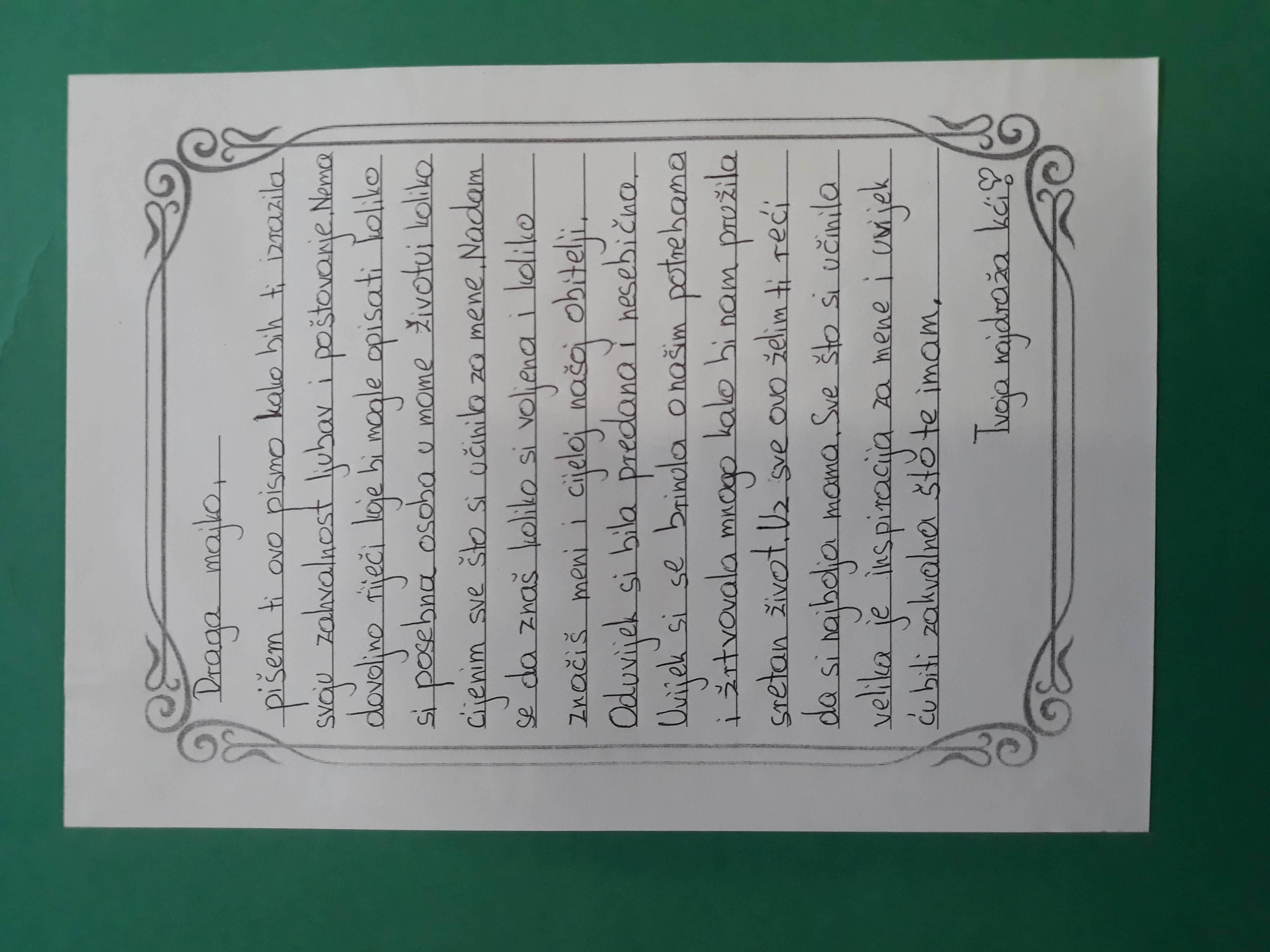 Majčin dan u našoj se školi obilježava svake godine na različite načine. Na taj dan majkama i bakama djeca i unuci obično daruju cvijeće ili mali poklon koji su sami izradili. Učenici 7. d razreda svojim su majkama poklonili pisma u kojima su im izrazili svoje poštovanje i zahvalnost, najdublje osjećaje i najljepše želje. Pisma su pohranili u zajedničku mapu kao trajnu uspomenu na ovogodišnji "dan majčinstva".