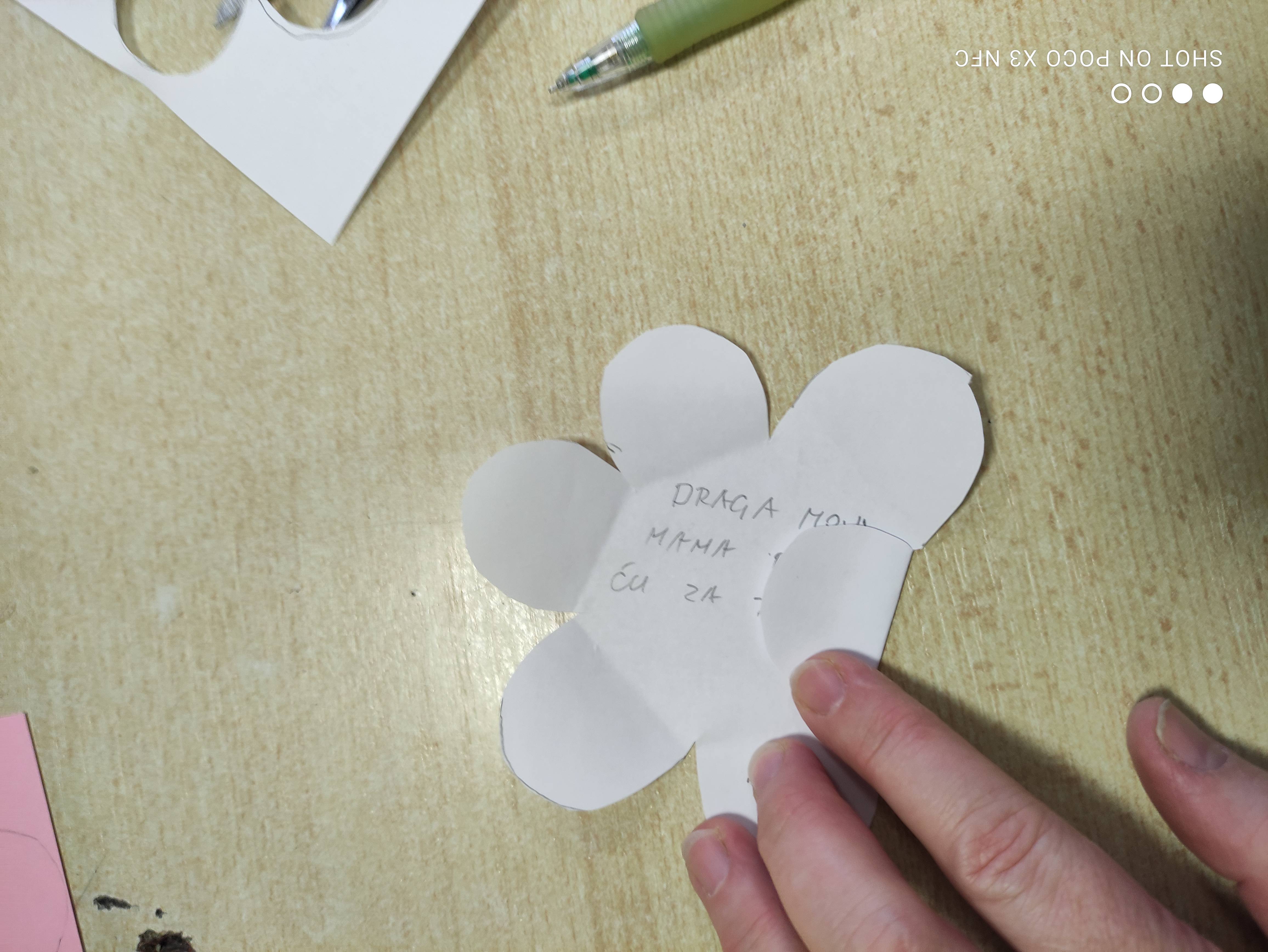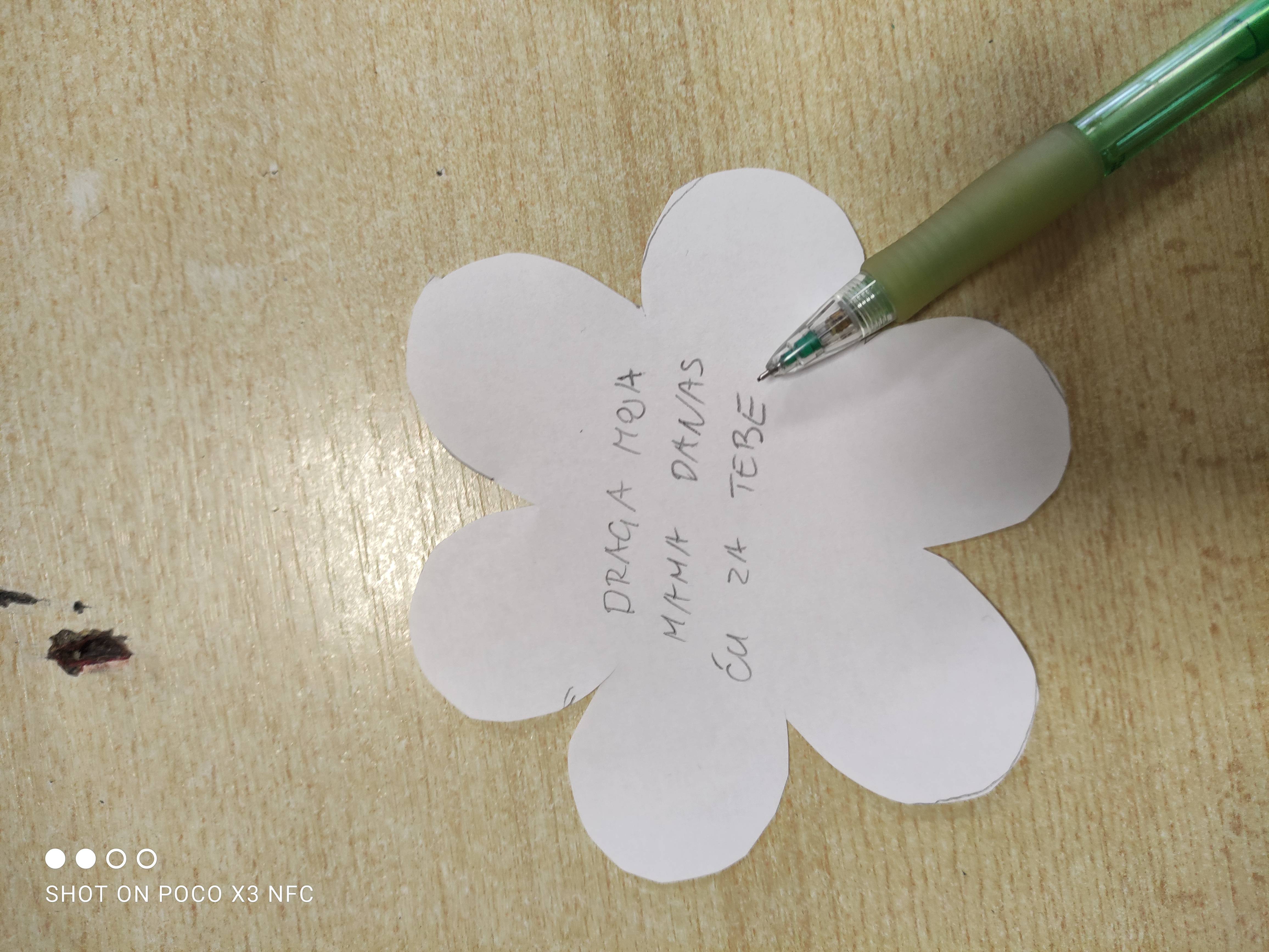 Draga mama, ove godine ti za Majčin dan nisam kupovao poklon, ali sam ga pripremio od srca i s ljubavlju i što je najvažnije trajat će deset dana. (ukoliko želite možete staviti i više ispisanih cvijetića u staklenku, ali deset obavezno) Pripremio sam tombolu za tebe i da znaš svaki listić je dobitna kombinacija. Svakog dana (osim nedjelja) izvuci jedan listić i stavi ga u tanjurić s vodom i vidjet ćeš koji dar sam toga dana pripremio za tebe.