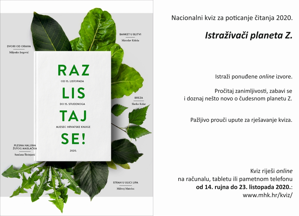Detaljne upute za rješavanje kviza pročitajte u virtualnoj čitaonici knjižnice svoga razreda na platformi Edmodo ili na mrežnim stranicama manifestacije Mjeseca hrvatske knjige.