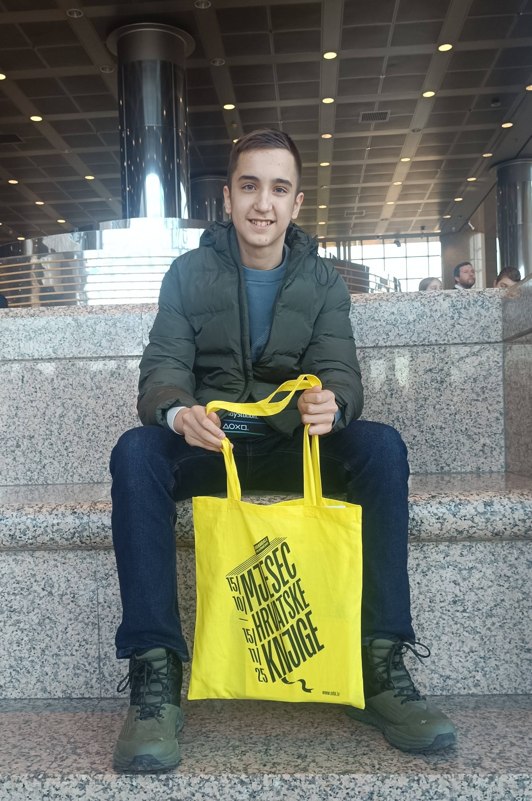Učenik Florijan Jambrak, 6.d ispred zgrade NSK i u društvu pisca Igora Rajkija