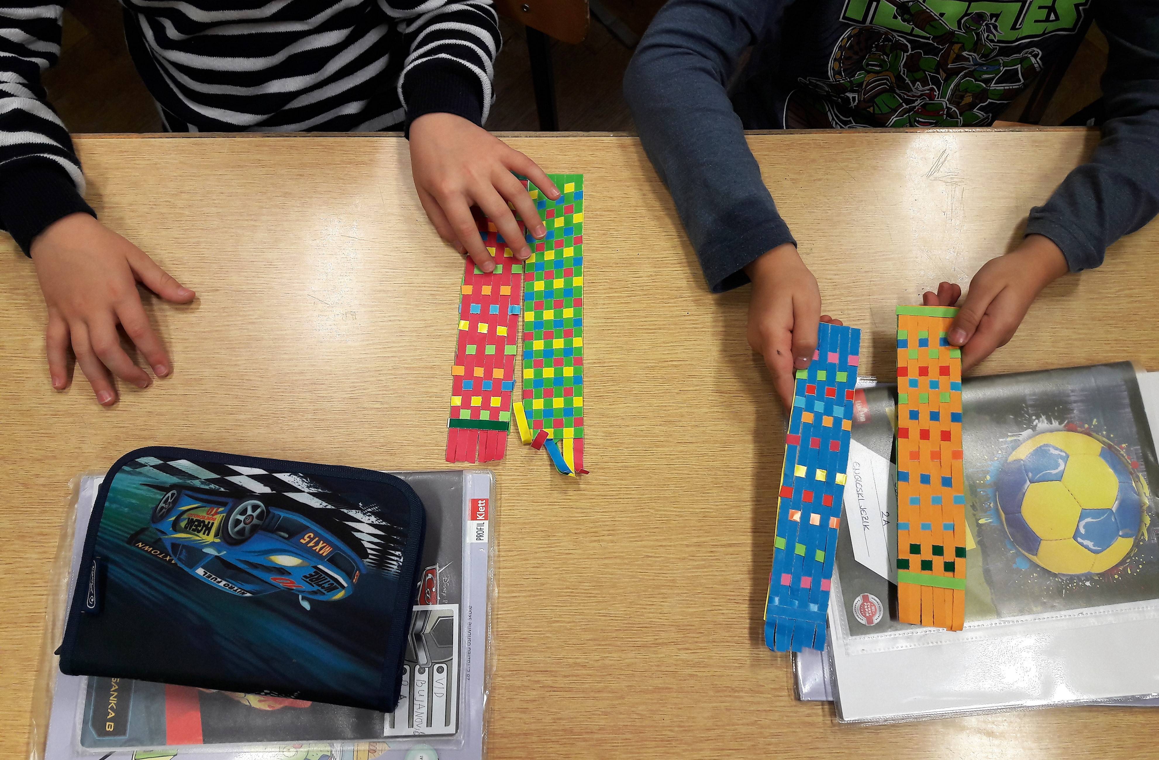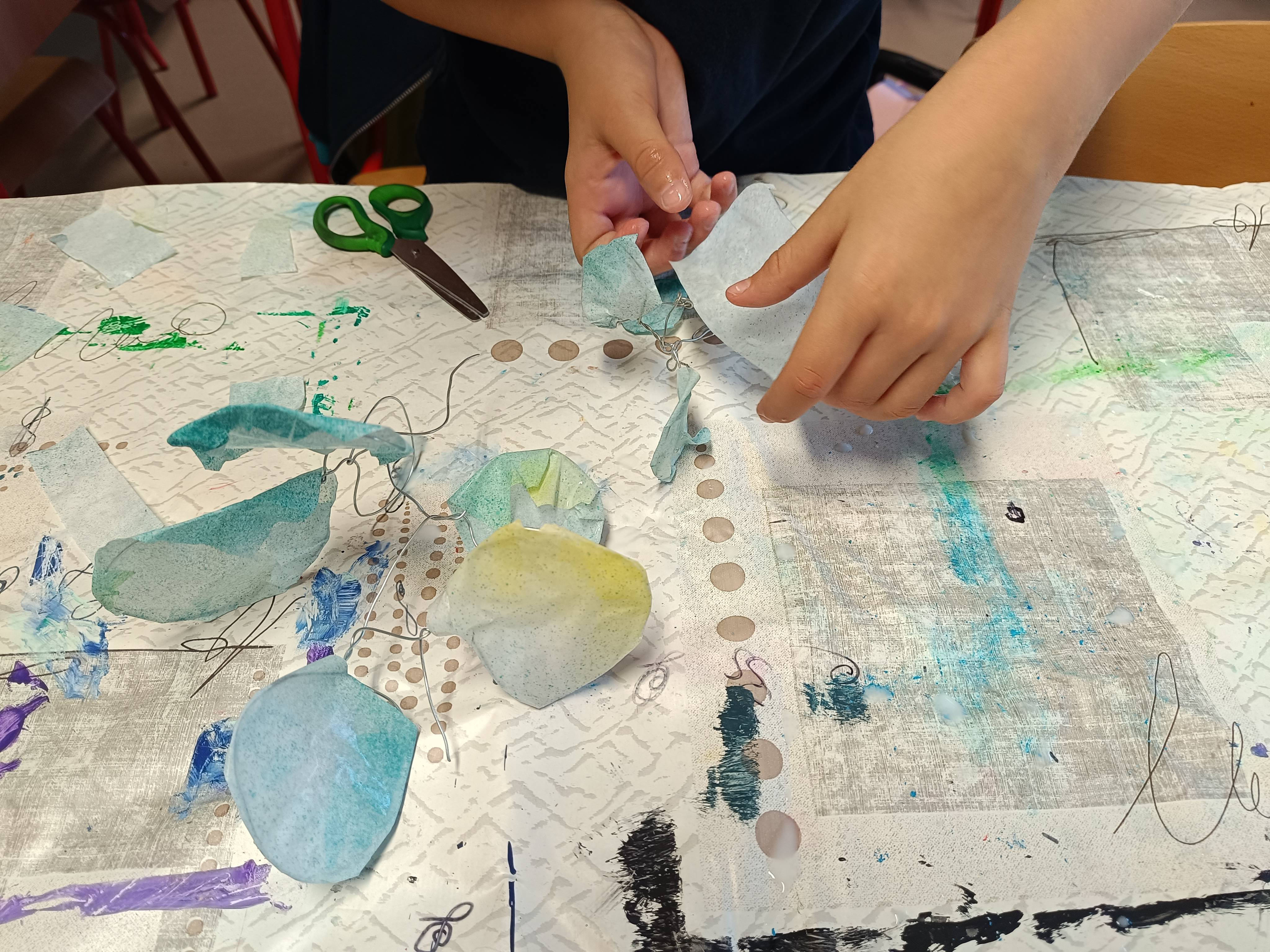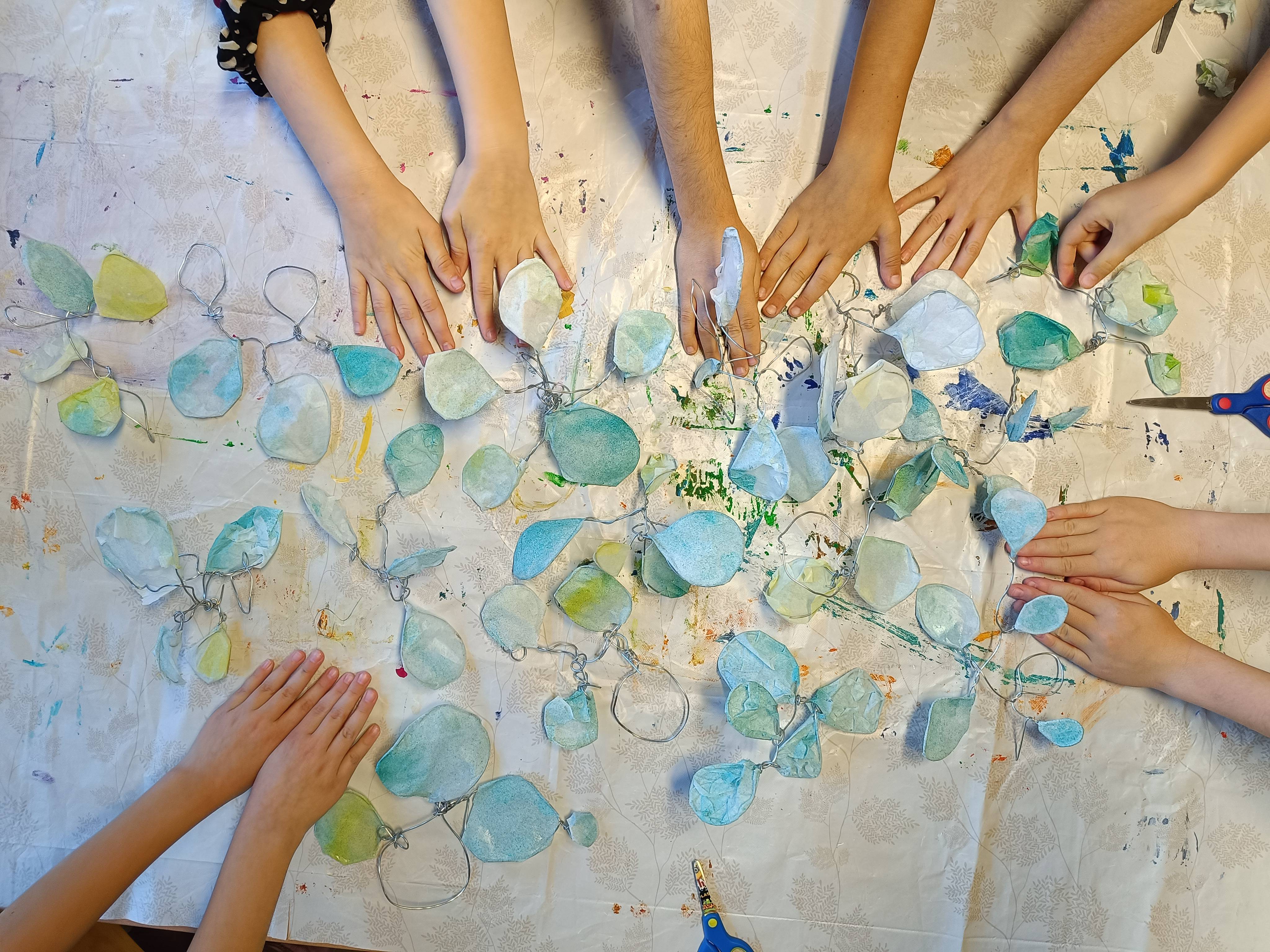 Vrijedne ruke učenika 3.a i 3.b razreda sa svojom knjižničarkom i učiteljicama na satovima likovne kulture izrađuju mobile od žice u tehnici kaširanja.