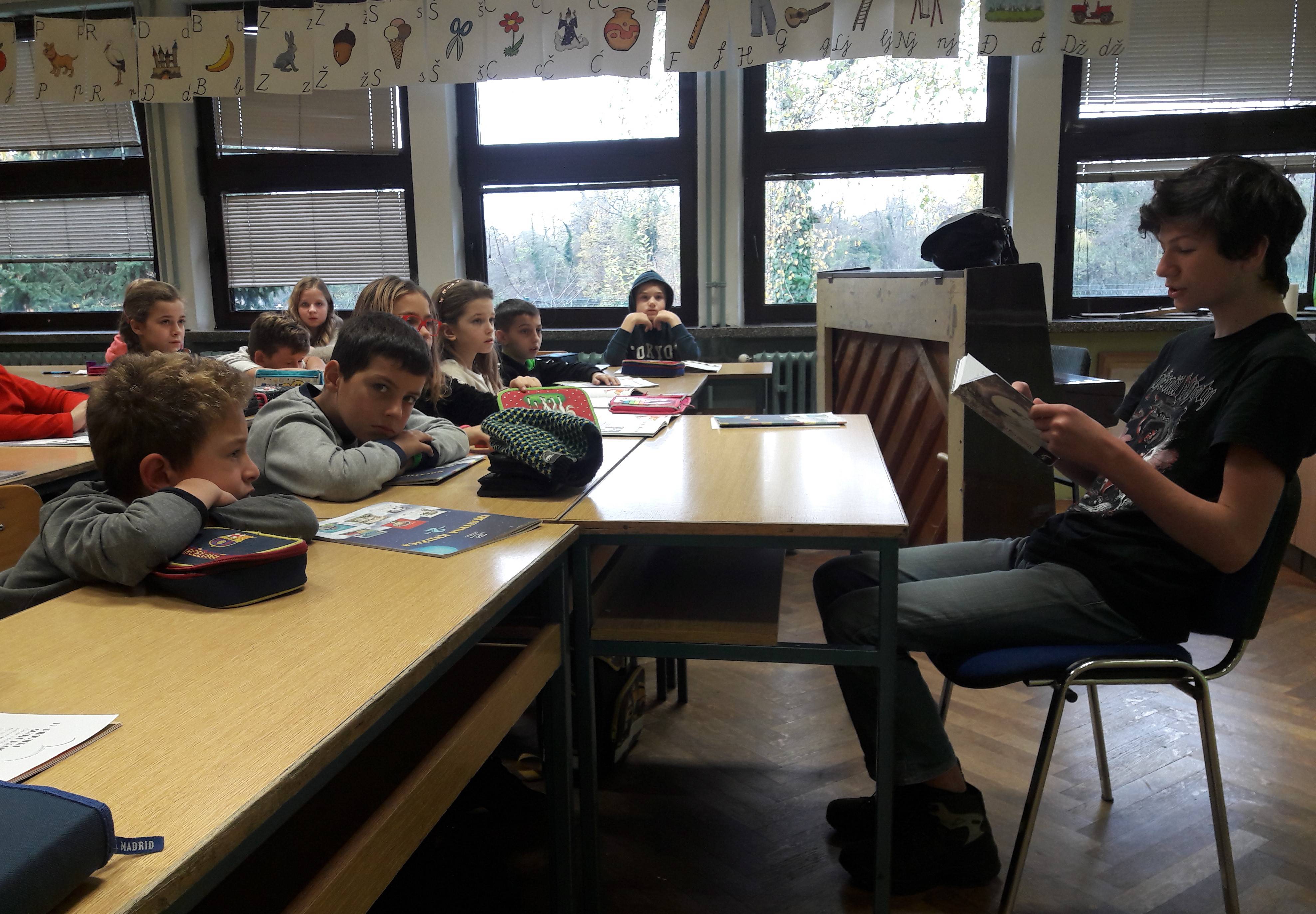 "Veliki čitaju malima" naziv je za aktivnost koju provodimo u našoj školi već niz godina, a riječ je o tome da stariji učenici čitaju zadanu priču mlađim učenicima. Na ovoj radionici učenik 7. razreda predstavio je učenicima 3.a razreda roman suvremene slovenske autorice Jane Bauer Strašna vila i Divlja zima. Riječ je o humorističnom i bajkovitom romanu za djecu koji opisuje brojne ljudske osobine kao što su sumnja, ljubomora, tuga i praznovjerje i u isto vrijeme nudi divne poruke o prijateljstvu i podršci. Sljedeće priče u romanu učenici čitaju po željama i dogovoru, tako da jedan od njih knjigu nosi doma i sutra ispripovijeda ono što je pročitao razredu. Učenici će se izmjenjivati u čitanju i predstavljanju sve dok ne pročitamo roman do kraja.