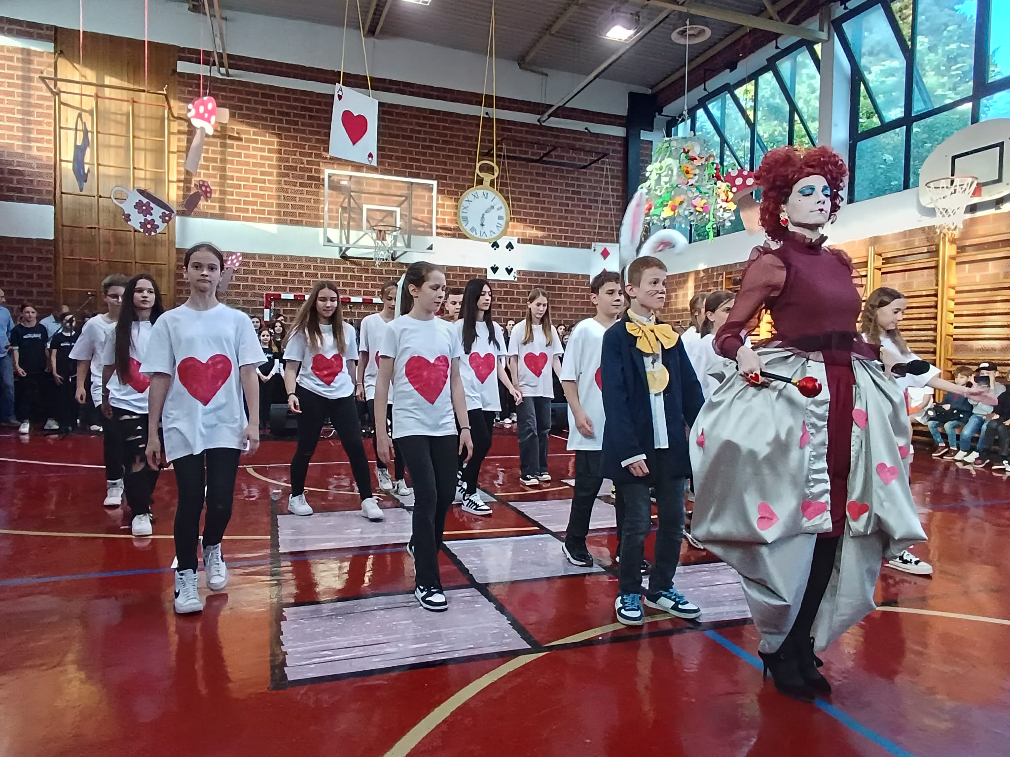 3. Aktivnost vezana za proslavu Dana škole angažirala je veliki raspon generacija i učenika. Cilj je bilo izraditi scenografiju, kostimografiju te vizualni identitet proslave i dramske igre Zemlja čudesa.