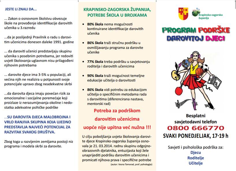 Krapinsko-zagorska županija u okviru programa podrške darovitoj djeci objavila je prigodni letak na kojem se daju bitne informacije o darovitim učenicima i na kojem je objavljena informacija da svi zainteresirani mogu nazvati besplatni savjetodavni telefon 0800 666 770 i razgovarati o darovitosti sa stručnim osobama.