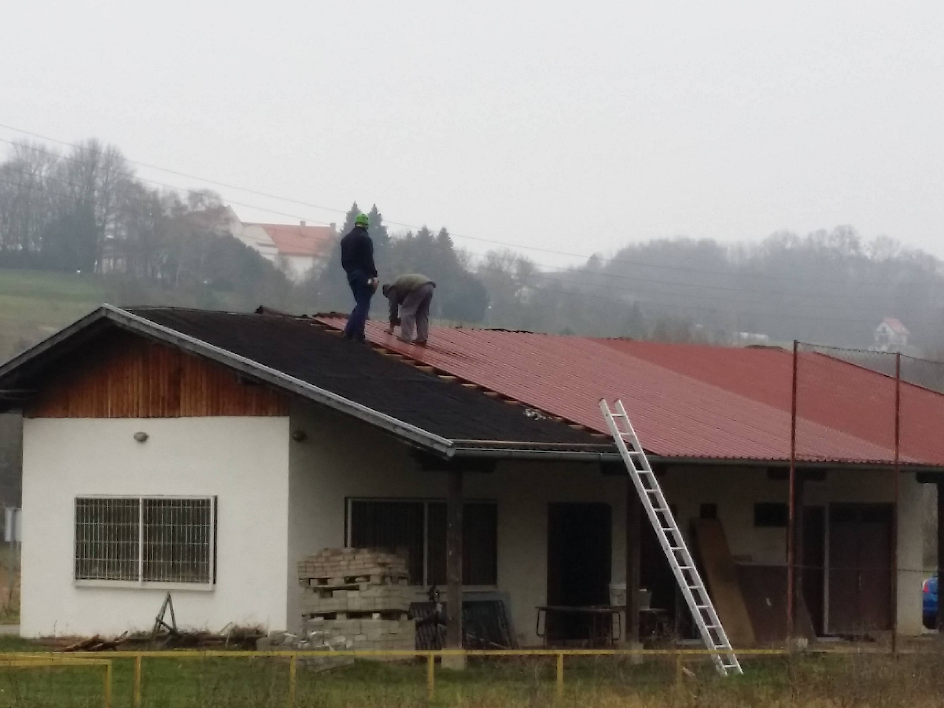 Vrijedni domari naše škole mijenjaju krovni pokrov na kućici kod igrališta. Zbog dotrajalosti i prokišnjavanja krova postavljaju se ploče valovitog lima.