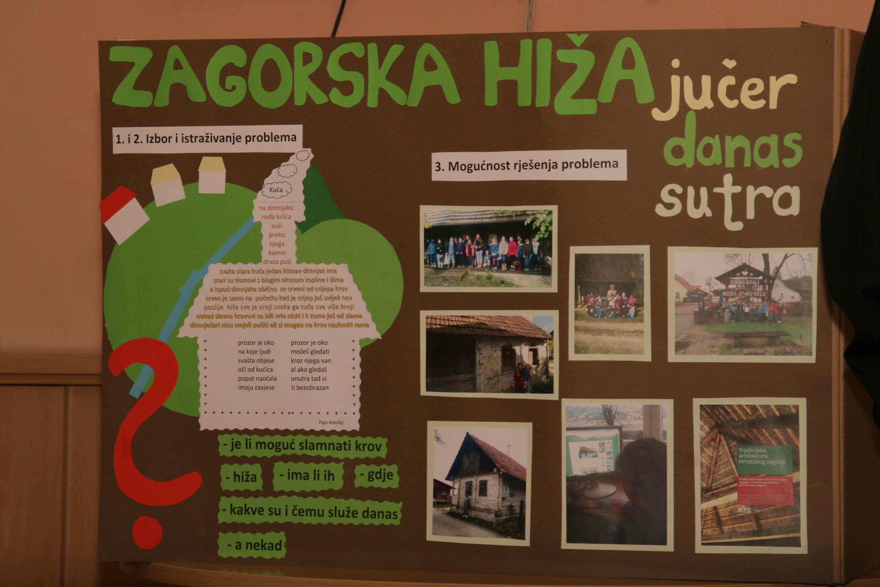 Projekt s prezentirali Mia, Filip, Luka, Jana i Antonija u ime 15 učenika 3.b razreda koji su osmislili i realizirali ovaj projekt. Zagorskih hiža na našim bregovima ima, a ponekad pokraj onih koje su zapuštene, napuštene, oronule i ruševine prolazimo kao pored smetnje, a malo je onih koji se zamisle i osvijeste da su one čuvarice našeg kulturnog, zavičajnog identiteta te bi ih trebalo sačuvati i obnoviti kako bi bile ponos našeg stubičkog krajobraza. A na valovitim i živopisnim zagorskim bregovima one su ukras i ponosne čuvarice kulturnog i etnološkog identiteta i naše povijesti.