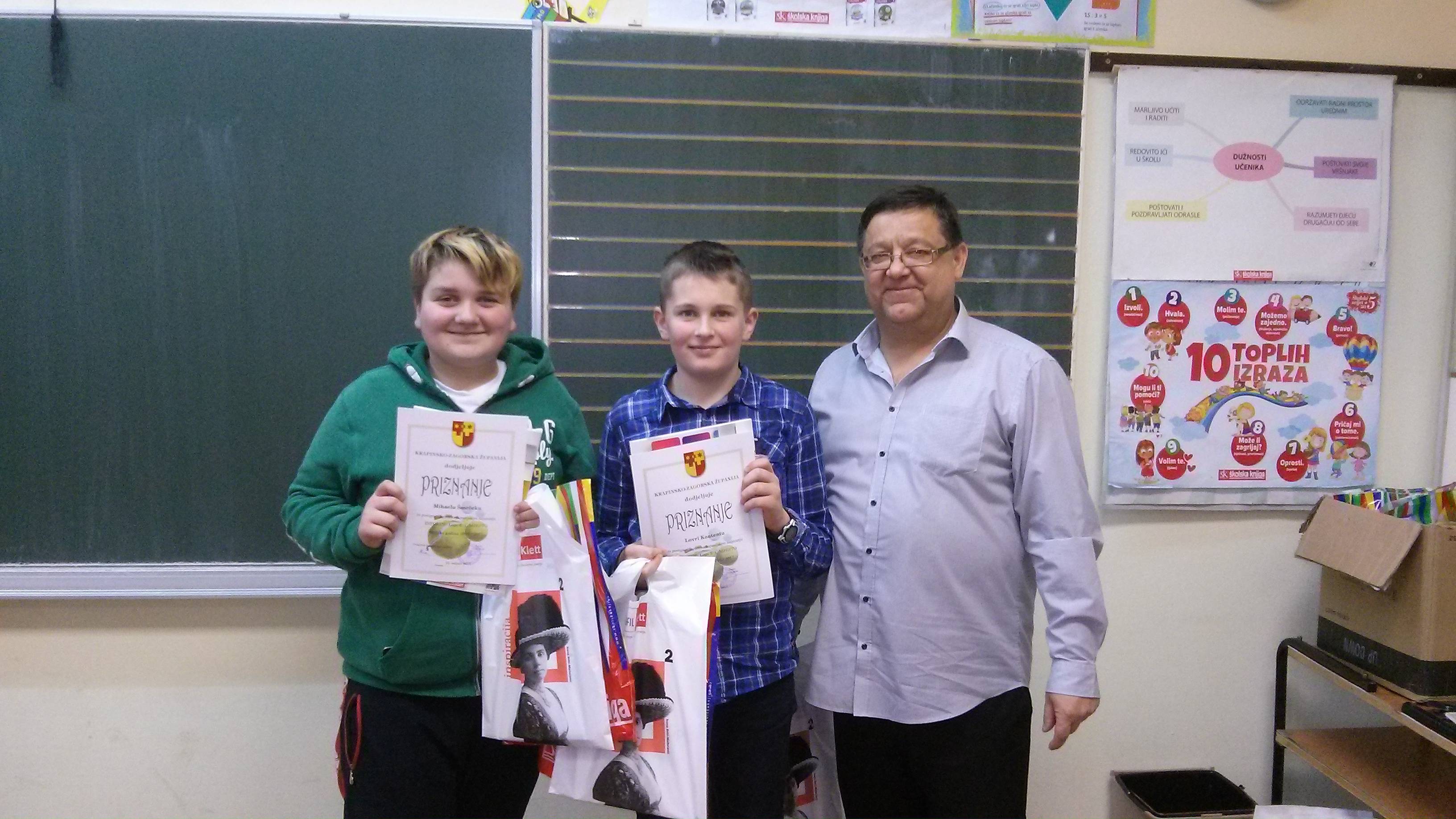 To znači da su oba naša predstavnika, Lovro Kontent, 5. a i Mihael Smrček, 6. b osvojili prva mjesta u svojim kategorijama, u programiranju u programskom jeziku LOGO. Uz priznanja za svoj uspjeh nagrađeni su knjigom, USB memorijom i raznim blokovima.