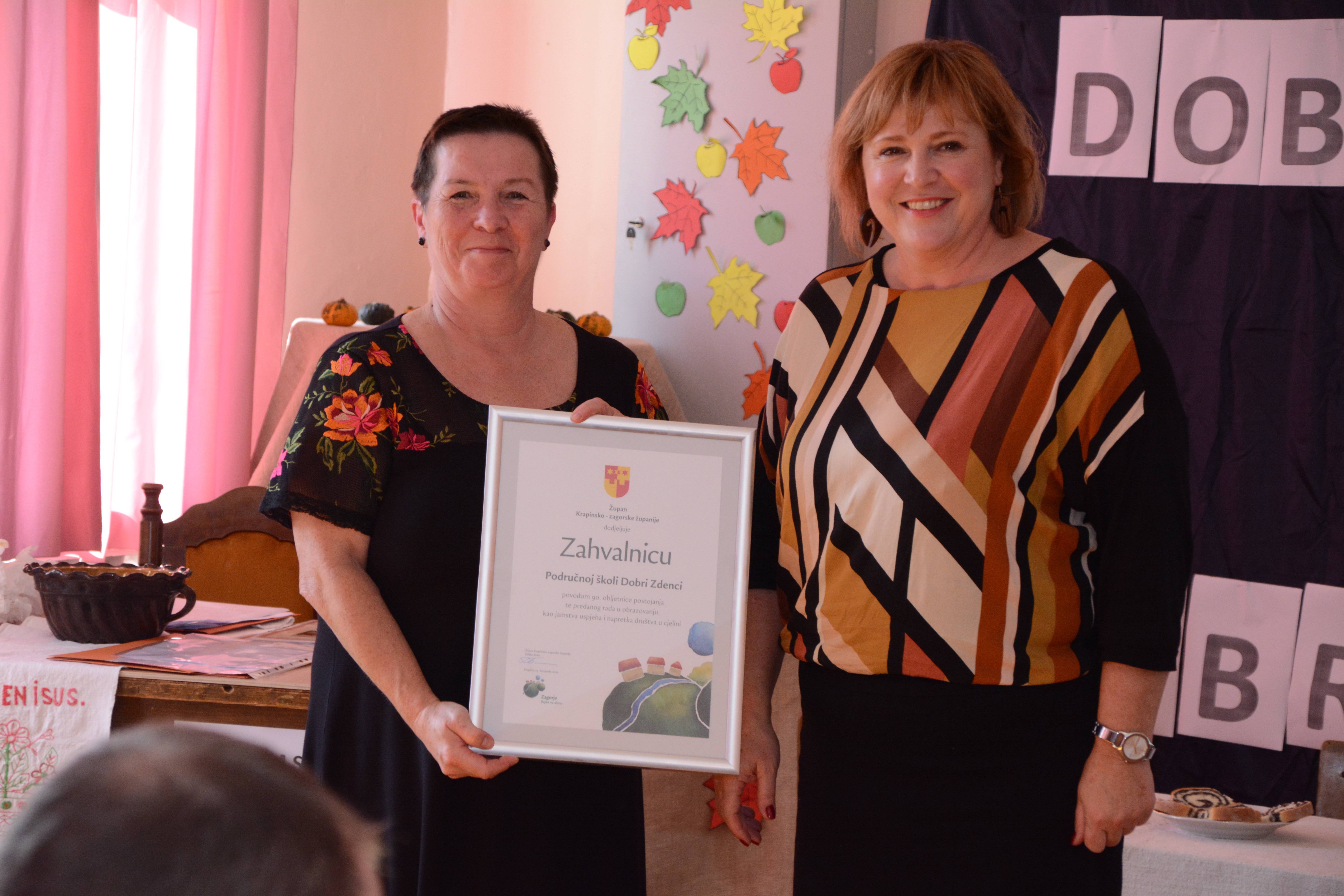 Zamjenica župana Jasna Petek uručila je ravnateljici Zahvalnicu Krapinsko-zagorske županije povodom 90. godina postojanja i djelovanja Područne škole Dobri Zdenci.