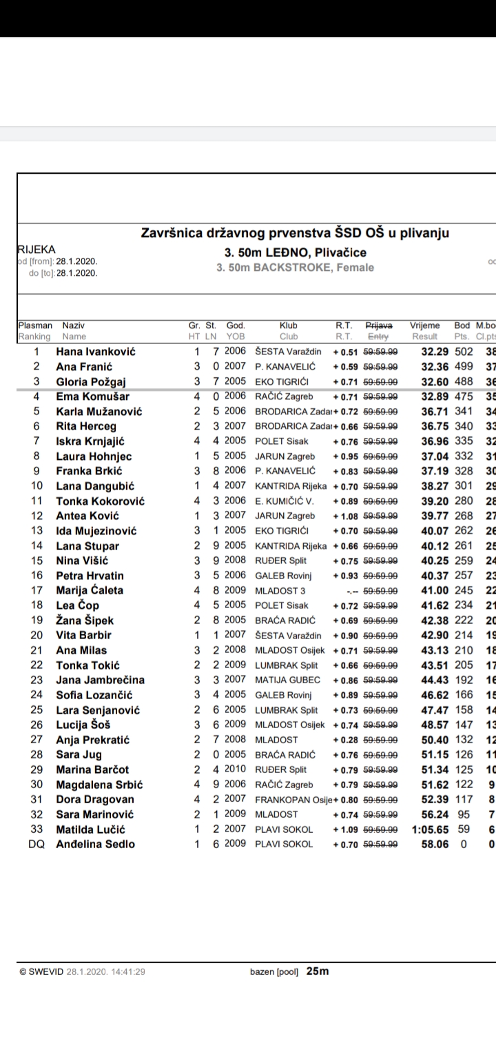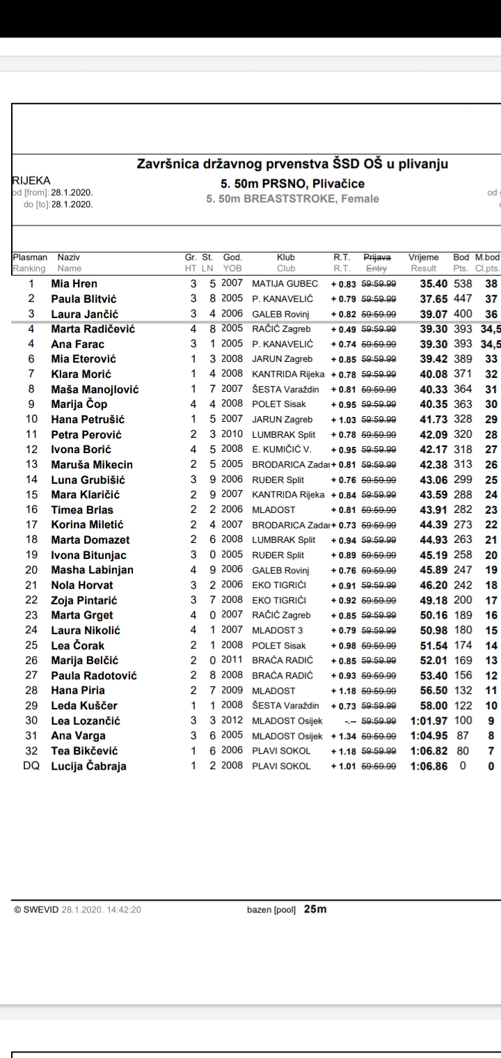 Jana Hren - slobodno, isplivala je izvrsno 13. mjesto, a Jana Jambrečina - leđno, odlično 23. mjesto.