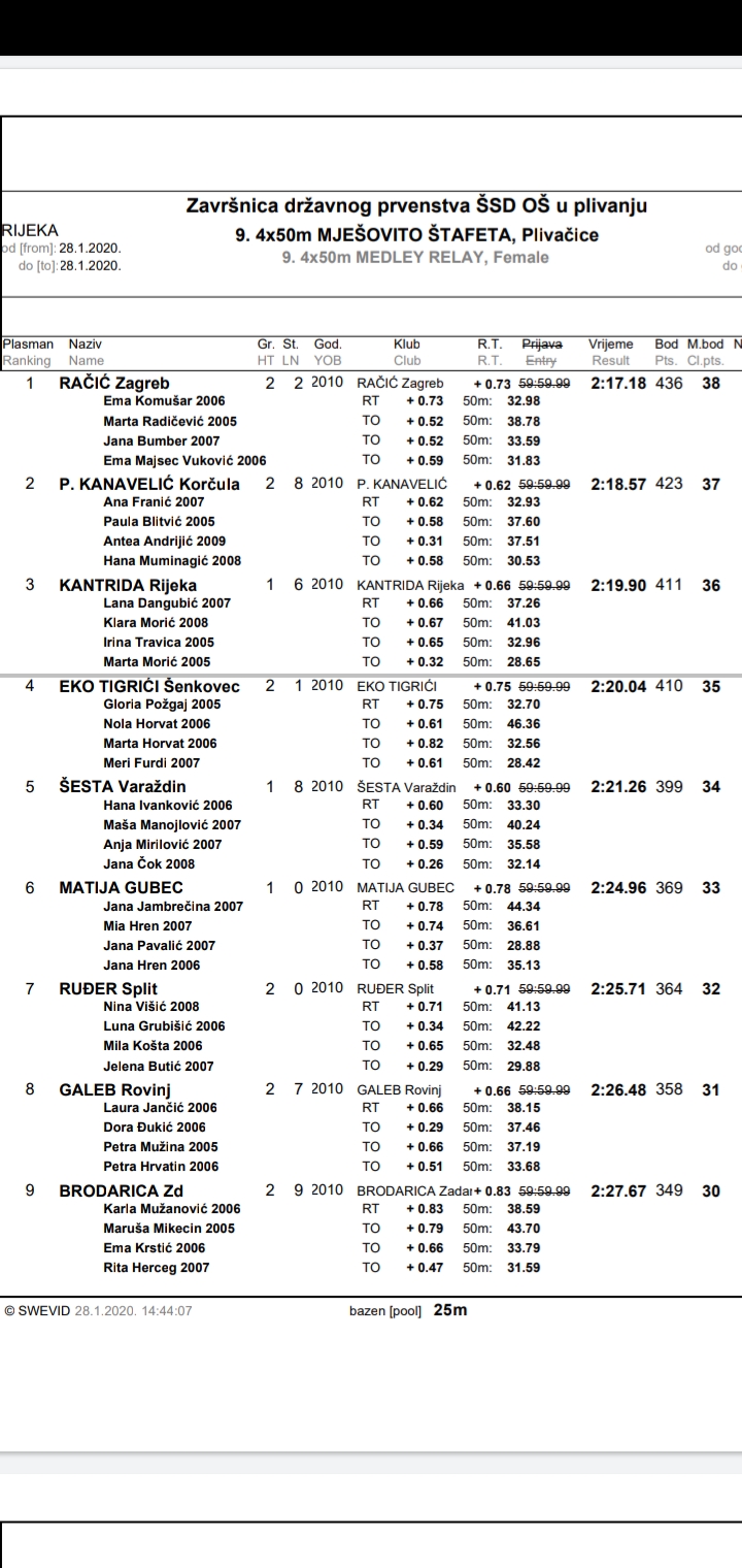 Dana 28.01. u Rijeci na bazenima Kantrida održano je ekipno Državno prvenstvo osnovnih škola u plivanju.