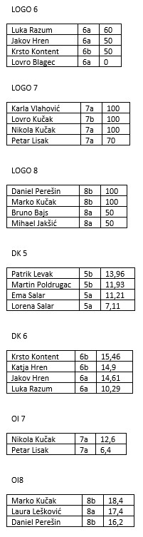Ovogodišnji pobjednici po kategorijama su Patrik Levak, 5. b (DK5), Krsto Kontent, 6. b (DK6), Nikola Kučak, 7. a (OI7), Marko Kučak, 8.b (OI8), Luka Razum, 6. a, (LOGO 6), Marko Kučak, 8. b (LOGO 8), a Karla Vlahović, 7. a, Lovro Kučak, 7. b i Nikola Kučak 7. b dijele prvo mjesto u kategoriji LOGO 7.
