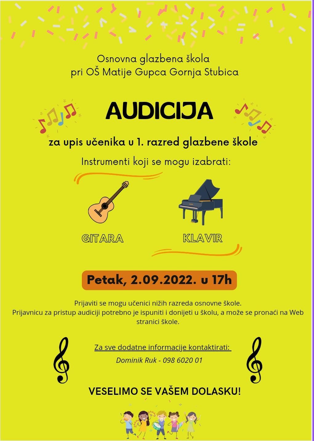 Glazbena škola pri OŠ Matije Gupca Gornja Stubica organizira audiciju za upis u 1. razred osnovne glazbene škole. U prilogu se nalazi prijavnica za upis u glazbenu školu koju možete popuniti i donijeti na audiciju, ili ju popuniti u školi.