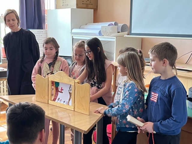 Gospođa Vera i gospodin Relja ispričali su nam Pticu rugalicu i poznatu priču Pale sam na svijetu te potaknuli naše učenike na kreativni izričaj. Uživali smo, a za kraj je uslijedilo iznenađenje – našoj su školi poklonili razredno kamišibaj kazalište!!!
